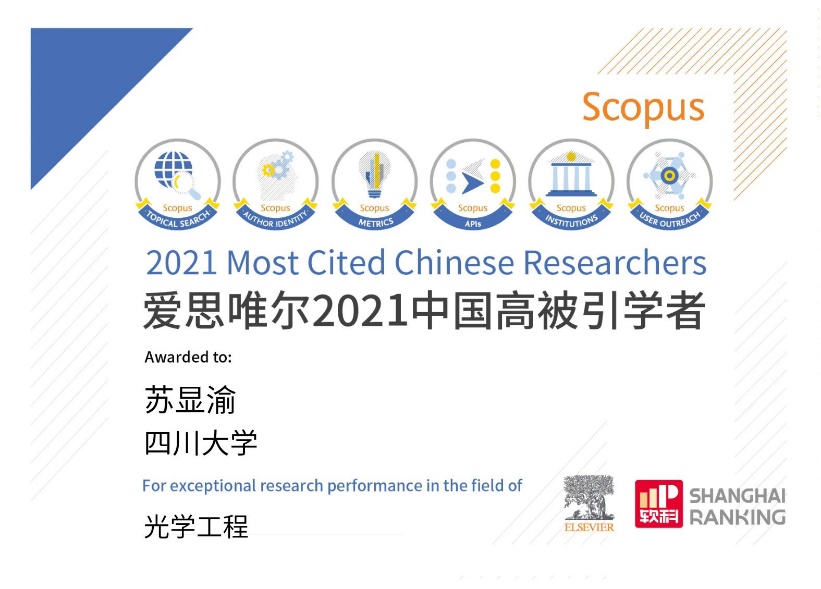 苏显渝教授入选光学工程学科领域名单。2021爱思唯尔“中国高被引学者”榜单以全球权威的引文与索引数据库——Scopus作为中国学者科研成果的统计来源,采用软科(上海软科教育信息咨询有限公司)设计的遴选方法,最终遴选出各学科最具全球影响力的4701名中国学者。