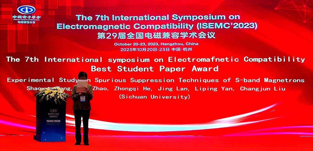 无线能量传输教育部重点实验室积极组织师生参加会议。刘长军教授指导博士生王绍岳开展大功率磁控管微波源的研究,完成题为“Experimental Study on Spurious Suppression Method of an S-band Magnetron”的论文,进入了ISEMC’2023优秀学生论文的决赛。经过现场报告并回答评委质询,最终荣获ISEMC’2023会议的Best Student Paper Award奖项。