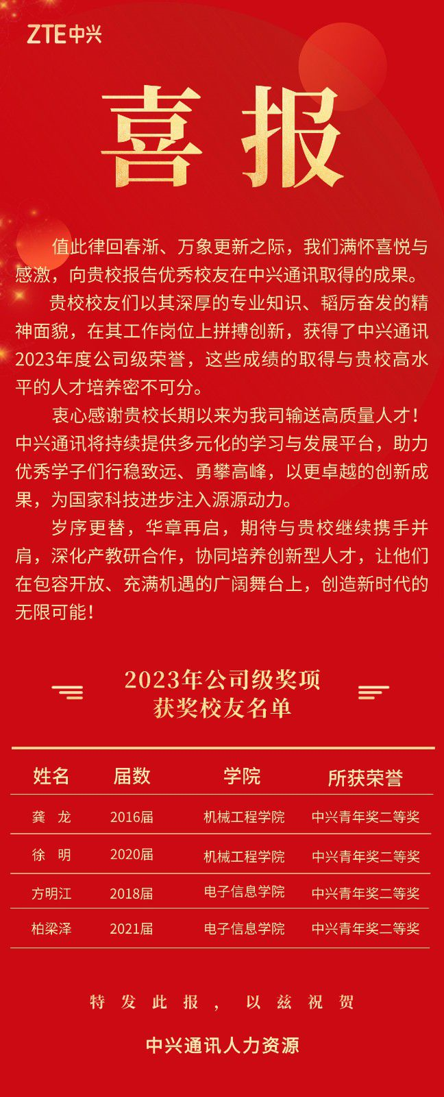 近日,学校收到中兴通讯发来的喜报,对获得中兴通讯2023年度公司级荣誉的优秀校友进行通报,并感谢学校为公司输送的高质量人才。其中,小欧视频 2018届硕士毕业生方明江、2021届硕士毕业生柏梁泽都荣获中兴青年奖二等奖。