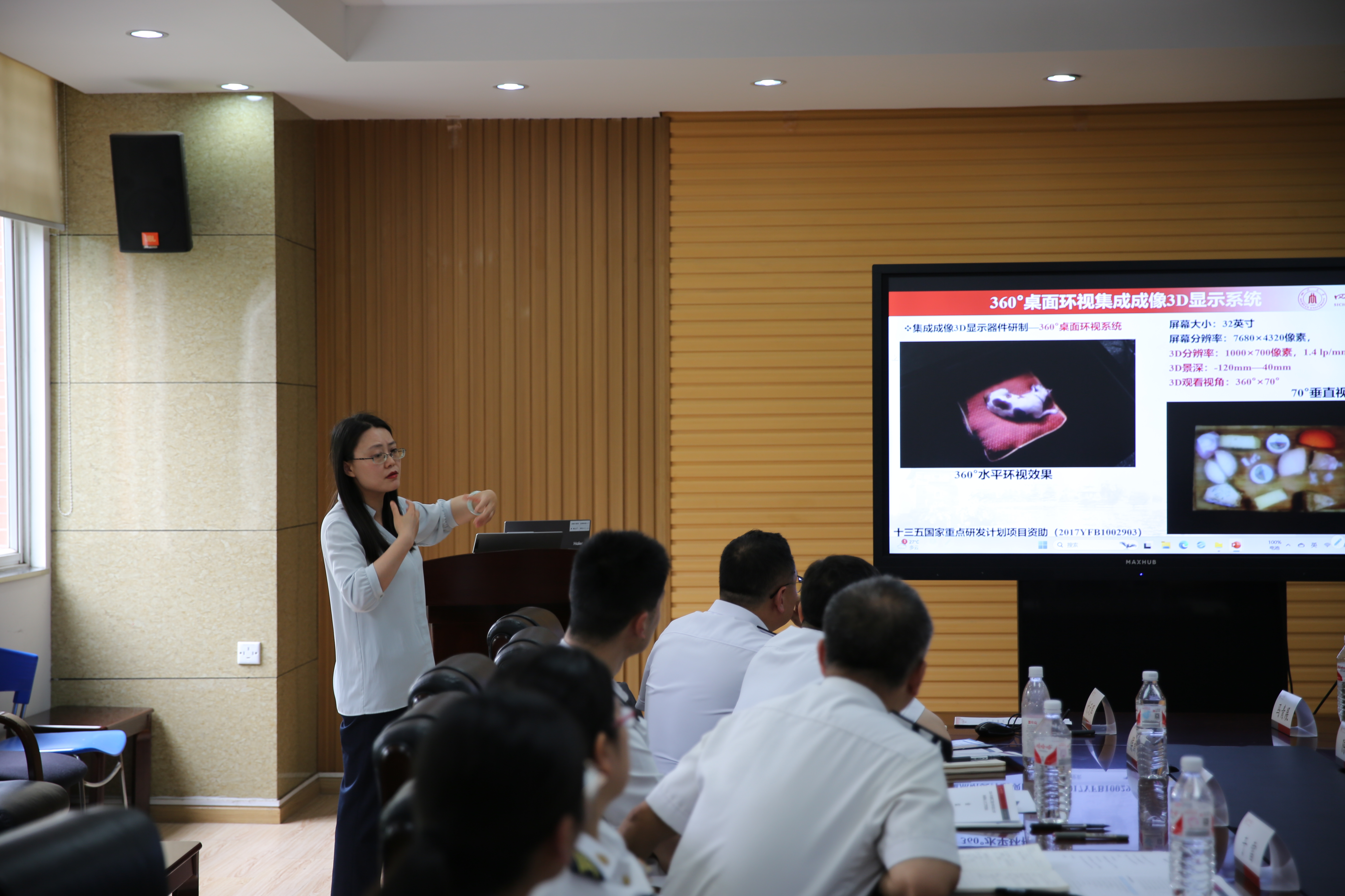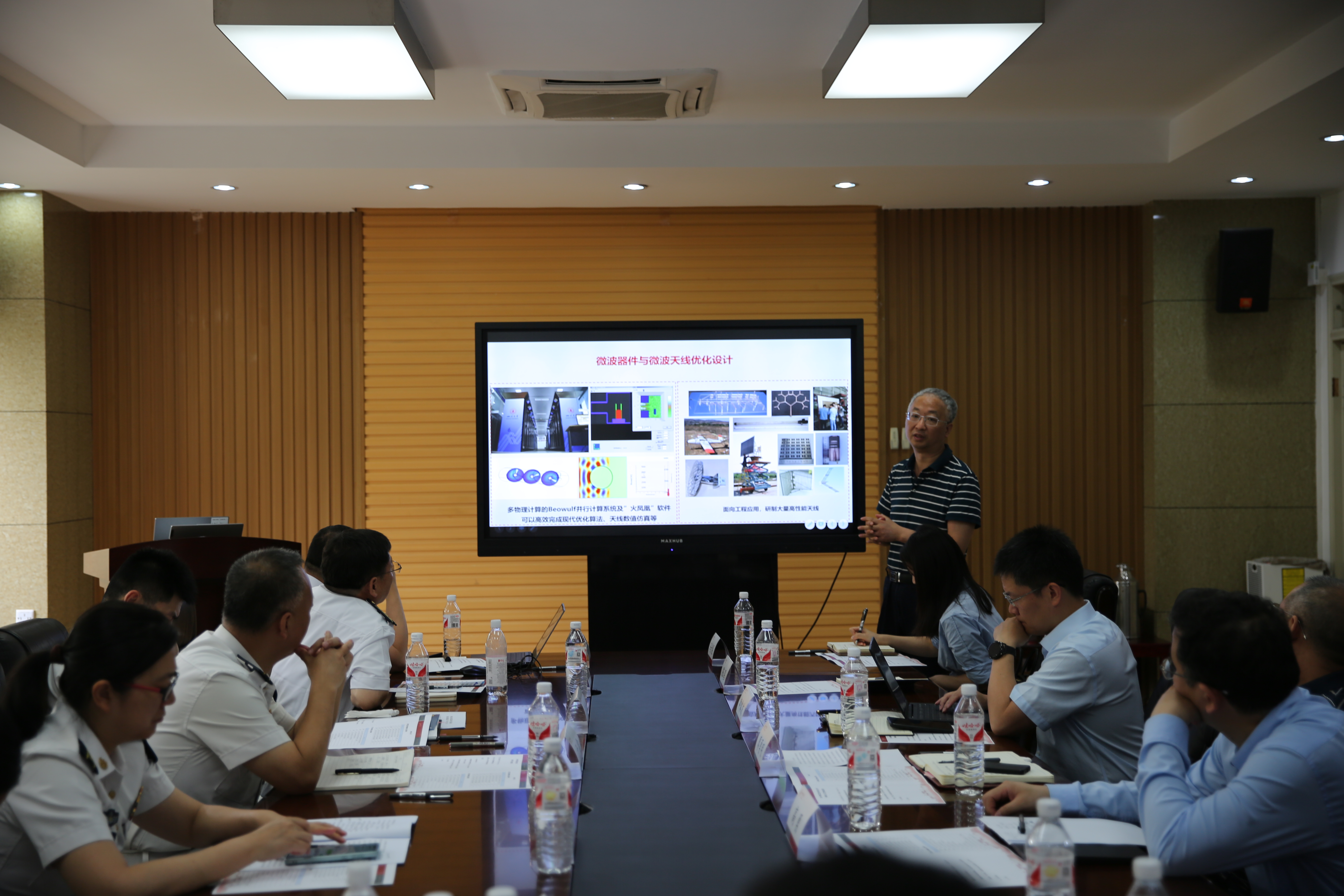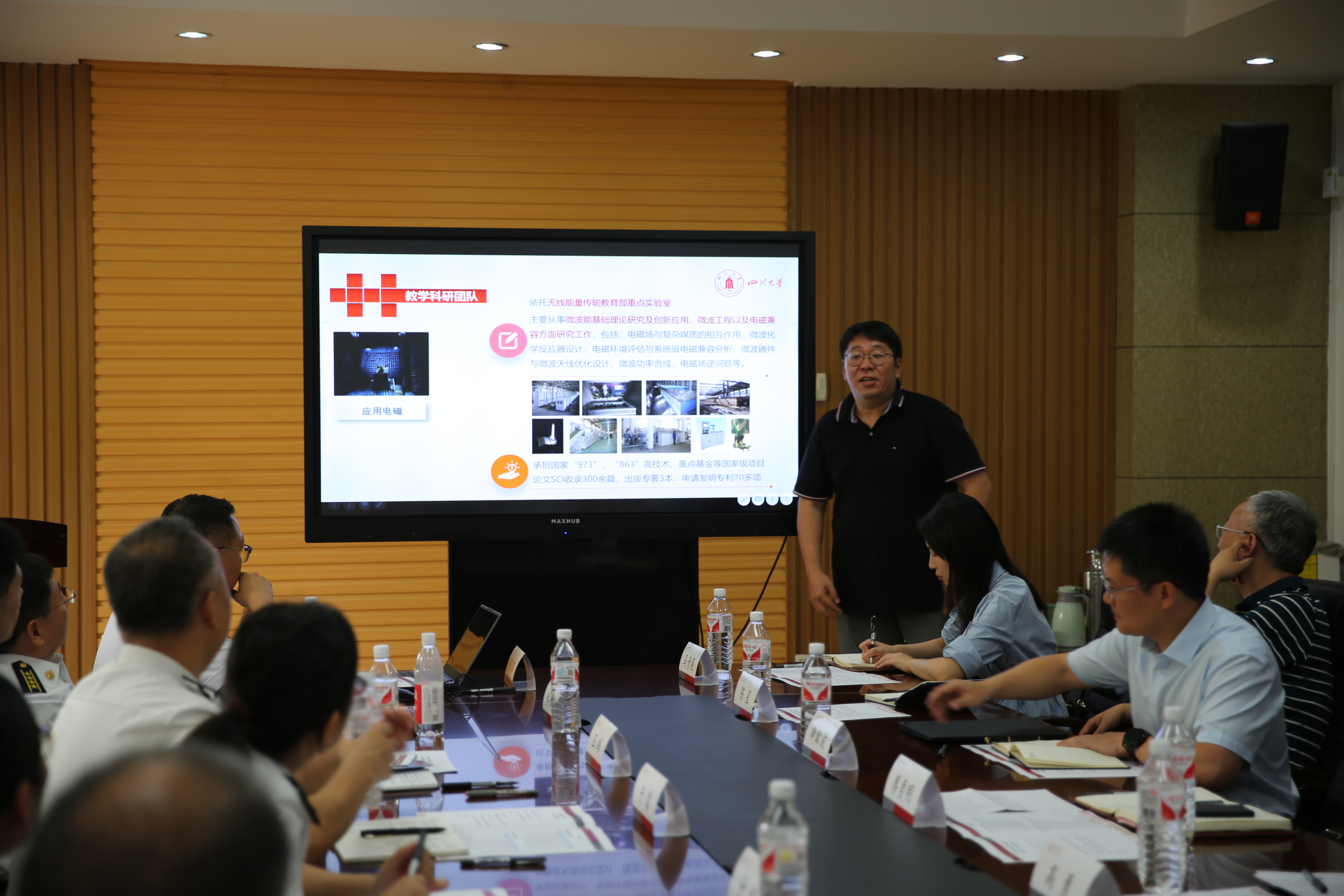 各科研团队分别进行了讲解,首先电子科学与技术系王策副教授介绍了其科研团队在微波无线能量传输、电磁屏蔽及微波的工业应用等特色学科方向的科研成果。接着,陈星教授向大家介绍了微波器件与微波天线的情况,以及所研究方向的工业应用。随后,光学工程系周昕教授代表光电对抗技术与系统团队,介绍了其团队工作布局及特色、工作基础和成果以及下一步的工作思路。邓欢教授交流了裸眼3D显示方向工作的相关成果,并带了实体为大家演示,激发了专家们的浓厚兴趣。最后,由武岳教授介绍了声学目标定位与成像系统及其相关应用。