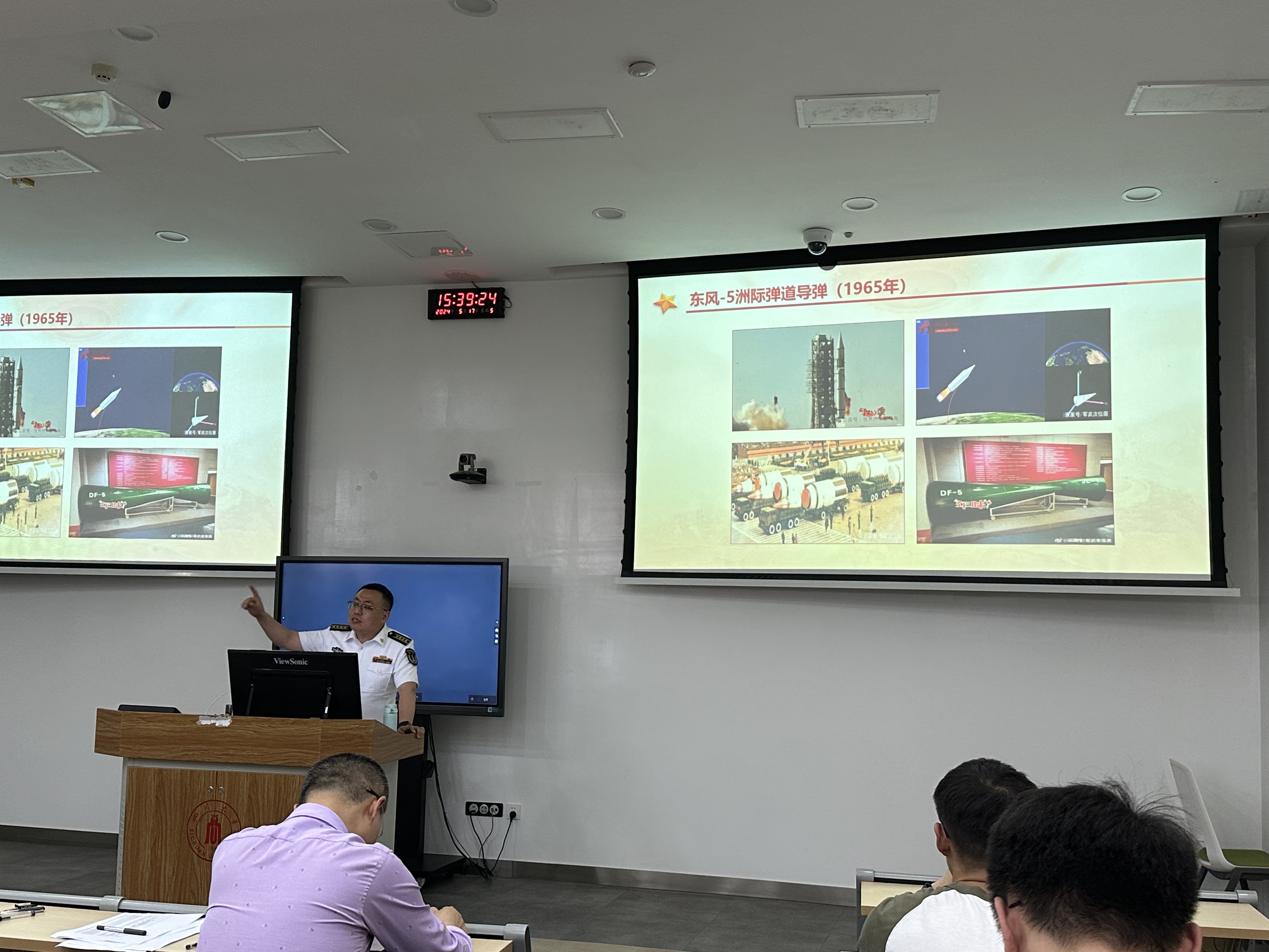 接着,海工大电子工程学院付教授以《以信领战 向海图强》为题,为同学们带来了一场声情并茂的素质教育课。付教授是海工大电子工程学院通信工程教研室专业技术大校主任,学校教学委员会委员、督导组成员,荣立二等功2次,三等功2次。在课程中,付教授的讲授内容分为回首往事、卧薪尝胆、厉兵秣马和迎头赶上四个部分。首先他以国家安全历史事件作为背景,并从自身真实经历出发,生动地向同学们讲述了其思想转变和从军历程。同时,付教授普及了核导弹等“国之重器”的发展历程,使同学们了解到祖国发展的不易和如今的强大。然后以《国家发展和防卫力量的发展必须相符相承》、《信息技术是打赢未来战争的关键》和《居安思危,建设海上强国任重道远》三个部分的讲述,强调了保卫国家需要几代人的努力和信息技术的重要作用。