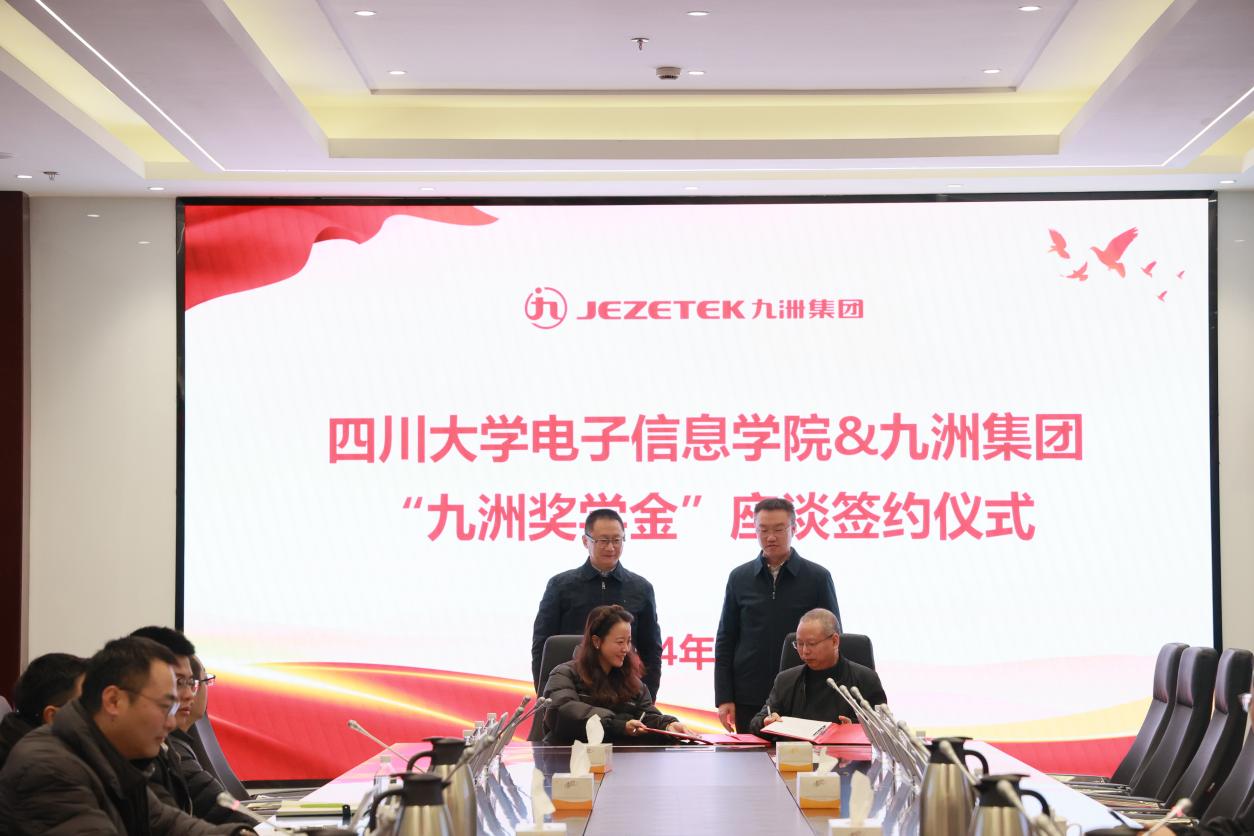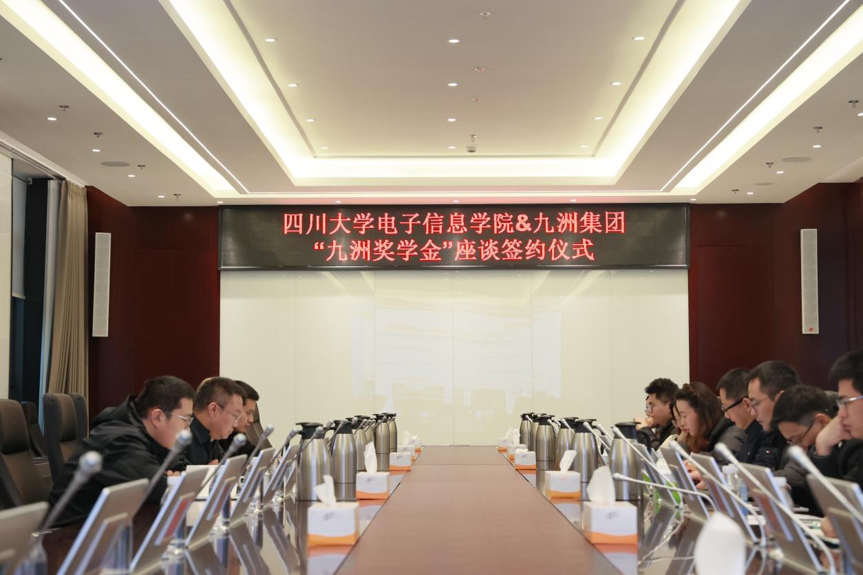 在奖学金签约座谈会上,九洲集团党委副书记、董事、工会主席游鲁热情接待了杨阳一行,双方就人才培养、科学研究、成果转化、校友工作等内容进行了深入交流。杨阳对九洲集团一直以来对学院在科研合作、学生就业等方面的支持表示衷心的感谢,九洲集团在学院设立奖学金为学院人才培养提供了有力支撑。