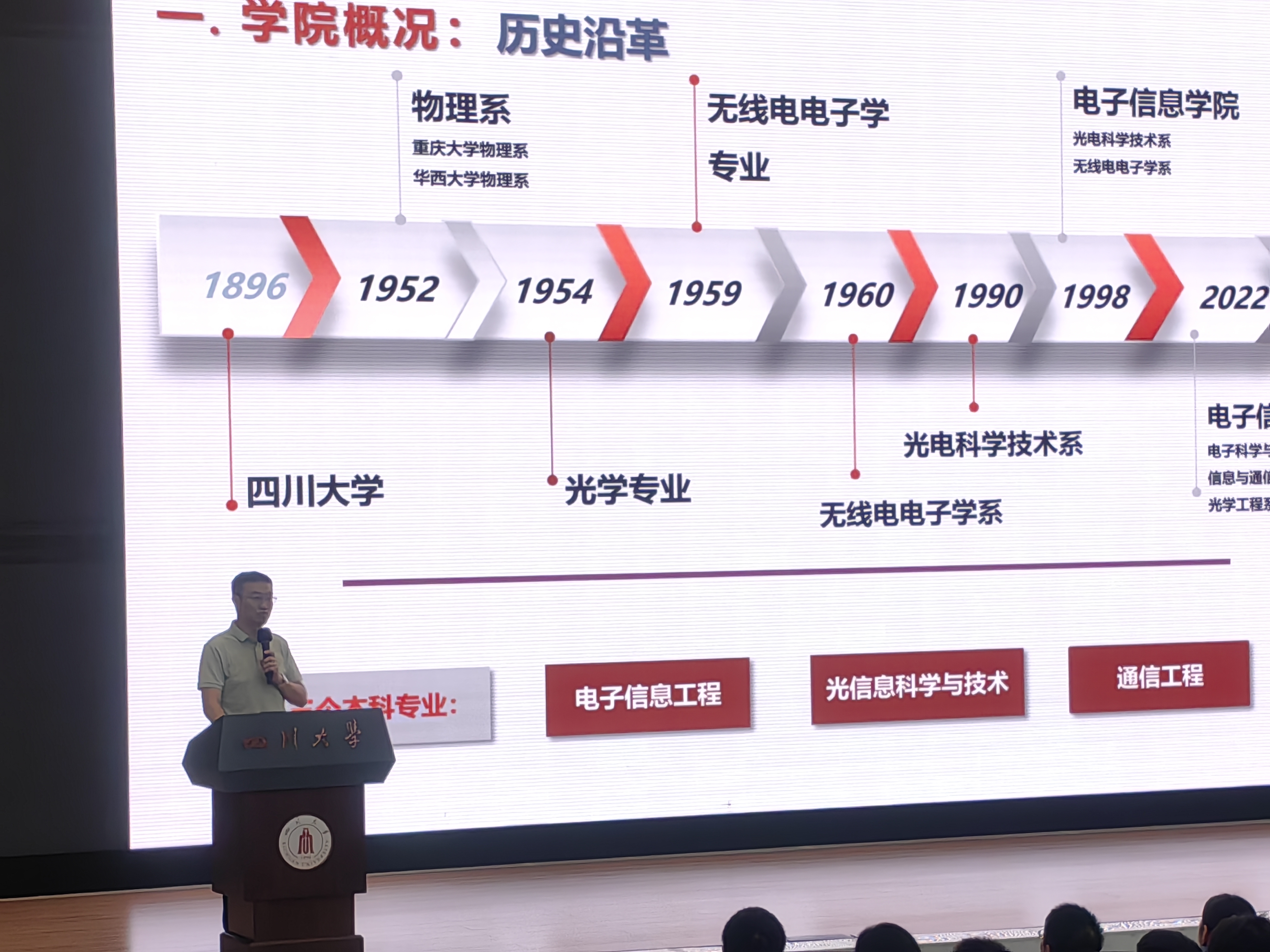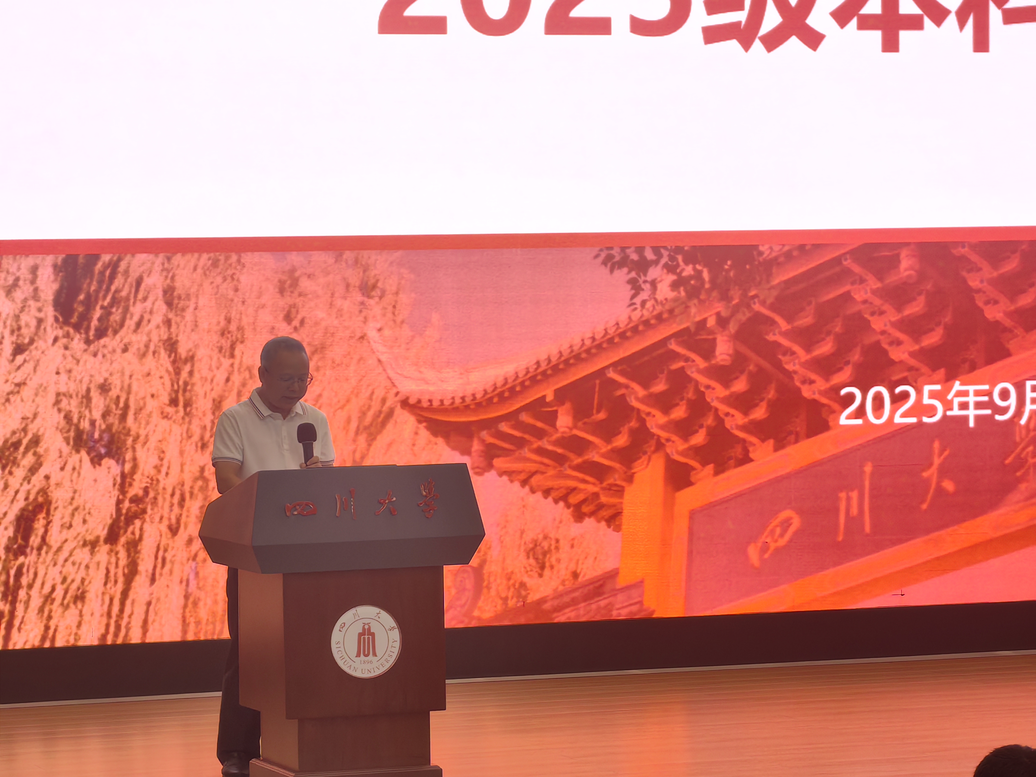 2025级本科新生开学典礼在江安校区水上报告厅隆重举行。学院院长杨阳教授,学院学术院长、教授委员会主席黄卡玛教授,学院党委副书记廖勇明老师,副处级组织员朱莉副教授,院长助理汪莎教授,信息与通信工程系系主任任超副研究员,信息与通信工程系副系主任孙亚萍副研究员,光学工程系副主任钟哲强副教授,教导员许虹老师,2025级新生辅导员孟滋常老师,学生科陈林老师、申鑫老师和全体2025级新生齐聚现场。典礼由廖勇明副书记主持,典礼在嘹亮的国歌声中开始。