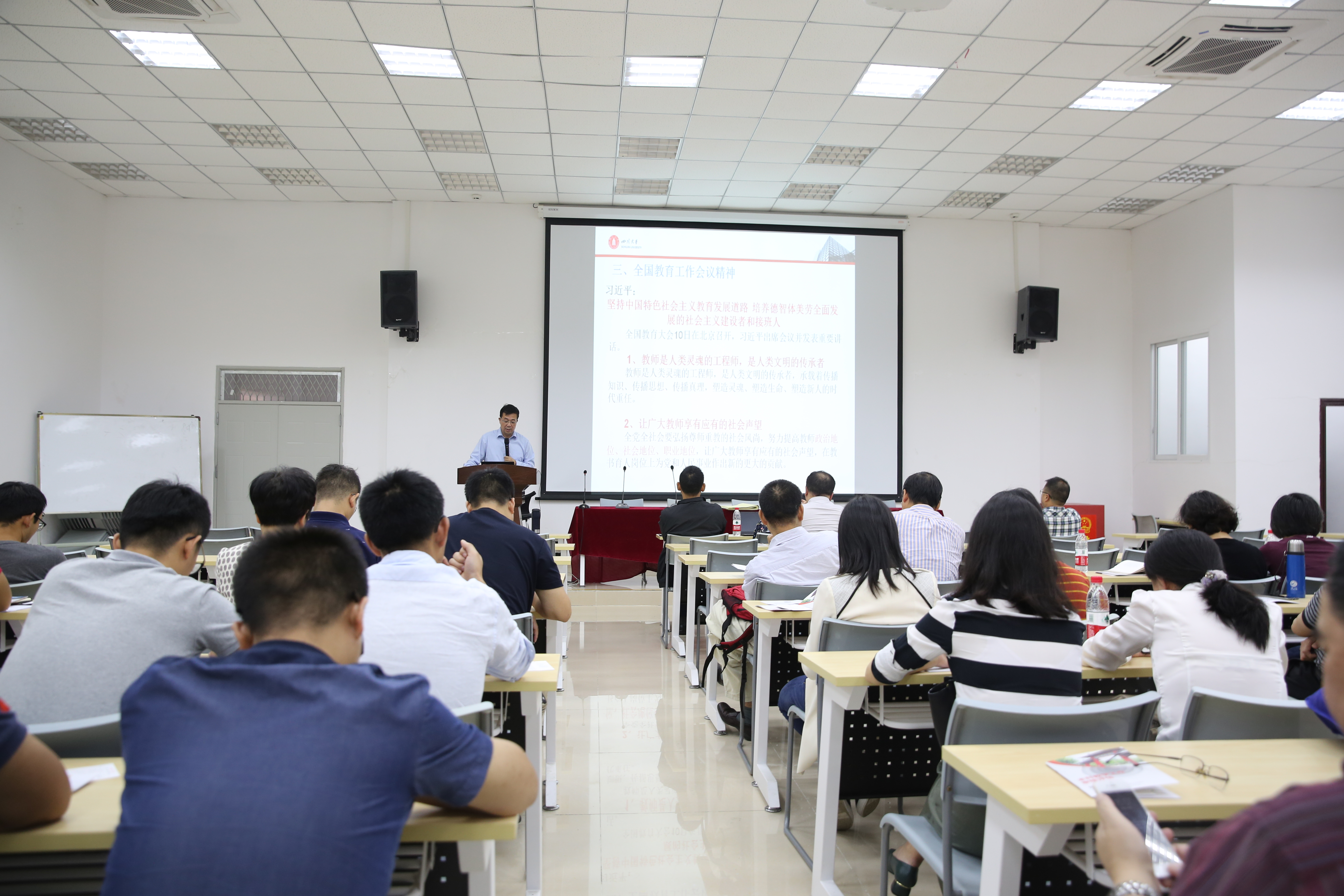 会议伊始,邰明松书记从教师是人类灵魂的工程师,是人类文明的传承者;让广大教师享有应有的社会声望;教育是国之大计、党之大计;9个“坚持”;培养什么人,教育的首要问题;5个“下功夫”等方面开展了深入学习,重点学习了9个“坚持”和5个“下功夫”。