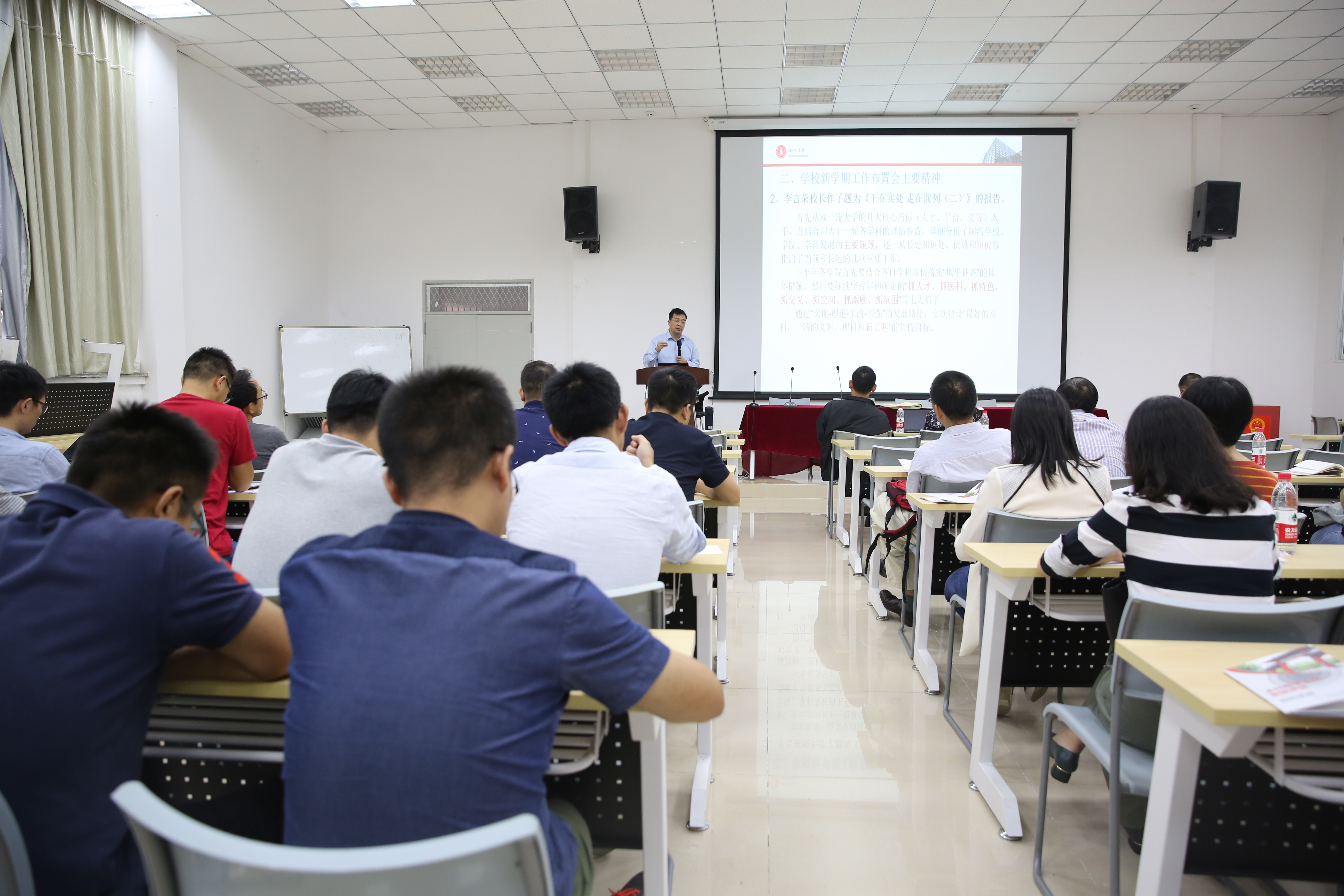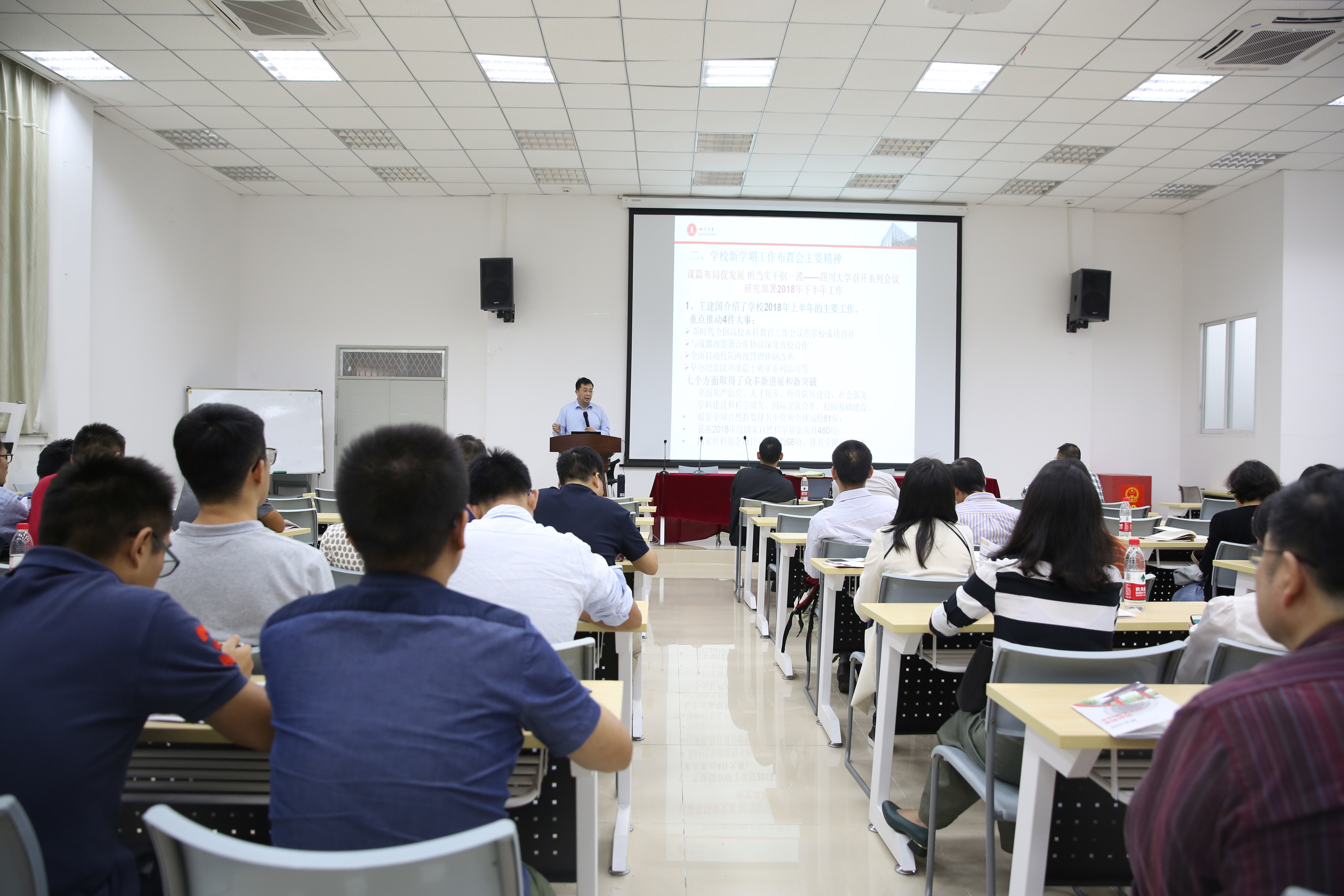 会议伊始,邰明松书记从新时代全国高校本科教育工作会议在学校成功召开、与成都市签署合作协议深化市校合作、全面启动校院两级管理体制改革、举办纪念汶川地震十周年系列活动等学校重点推动的4件大事,以及全面从严治党、人才培养、师资队伍建设、社会服务、学科建设和科学研究、国际交流合作、校园基础建设等七个方面取得的众多新进展和新突破传到了王建国书记新学期工作布置会的精神。