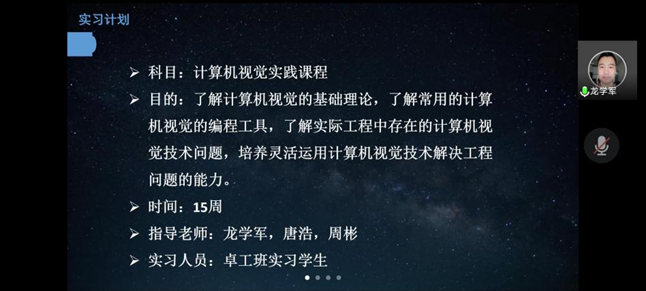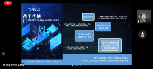 会议第一阶段由成都通甲优博科技有限责任公司首席技术官龙学军博士对实习单位情况进行介绍。首先,龙老师就公司发展状况和人员构成进行了简单介绍,使同学们初步了解实习单位。随后,龙老师就公司机器视觉和深度学习相关技术进行了着重讲解,吸引同学们兴趣,也为同学们对实习内容有了一定认识。