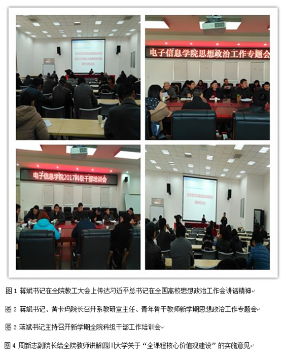 3、积极学习国家和学校重要教育方针政策,加强教师思想政治素养,立德树人。2月27日-3月3日,学院先后组织召开了领导班子、科级干部、系教研室主任、全院教工大会学习传达了会议上的重要讲习近平总书记在全国高校思想政治工作会讲话精神、教育部党风廉政建设视频会精神、小欧视频