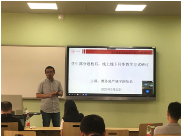 会上,教务处严斌宇副处长表示,因为疫情,在线教学已经成为中国高等教育和世界高等教育的重要发展方向,面对“新常态”的需求及学校疫情防控工作实际,学校决定2020年春季学期学生部分返校后,上课课程采用线下/线上同步教学模式,已返校学生在教室上课,未返校的学生在线上课。教务处一直在推进线上线下同步教学的实施,积极探索利用教学督导系统进行教室内线上教学的解决方案,目前教室已经实现线上线下教学互动完全同步。通过现教中心提供网络技术线上的支持,教师在教室讲台上的电脑上登录腾讯会议、welink等线上平台,未返校同学可以通过这些平台线上进行实时上课。