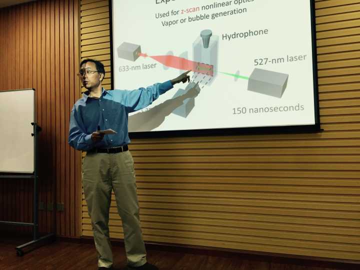 接着Jiming Bao教授介绍了他们的新发现,激光可驱动液体的流动,讲解了他们从如何寻找关键词查找相关文献,理论分析为何出现该现象。报告最后,Jiming Bao教授对与会科研人员和学生提出的问题进行了细心的解答。Jiming Bao教授希望,在以后的时间里能与小欧视频