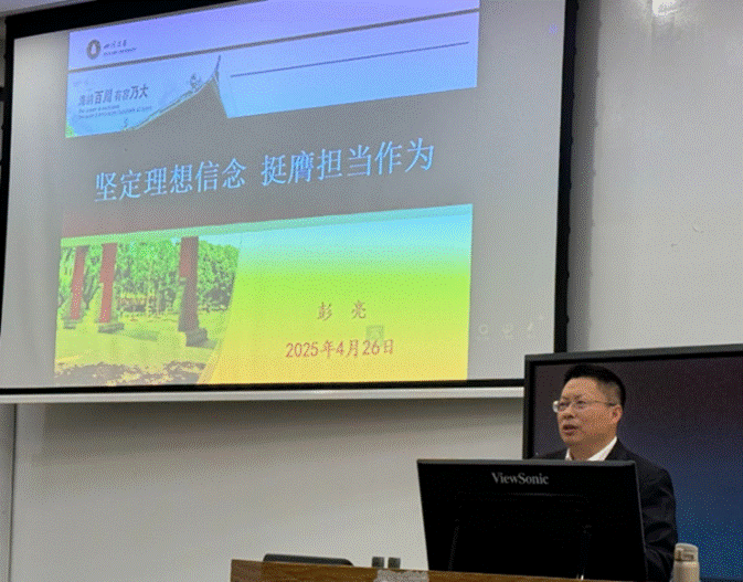 正处级专职组织员的彭亮老师以“坚定理想信念,挺膺担当作为”为主题进行授课。 彭亮老师从党的二十大精神入手,以“马克思主义中国化时代化”的思想境界高、“中国式现代化”的战略定位高、“全面建设社会主义现代化国家”的实践要求高,三个“高”深刻总结二十大,以宪章修改为切入点结合党章对成为合格党员的前提条件进行了系统的阐述。理想信念是一个人的世界观、人生观和价值观的集中体现。中国共产党人的理想信念就是实现共产主义远大理想和中国特色社会主义共同理想。并从党的性质的先进性和代表性、党的根本宗旨的人民性、党的理想信念的必然性、党的初心使命的一致性、党的指导思想行动指南的科学性指出坚定对党的理想信念。进一步以“四个自信”、“党的百年征程辉煌成就”、“党的严密组织、铁的纪律和优良作风”、“两个大局和机遇挑战”和“全面从严治党、勇于自我革命,永葆共产党员先进性纯洁性”几方面结合历史和党的治理与发展进一步强化坚定党的理想信念。接着彭亮老师从政治、思想、情感等多角度结合优秀党员模范提出“以实际行动坚定理想信念,做合格共产党员”。立足当前百年未有之大变局,彭亮老师通过结合当代多项科创突破、创新红色人才培养、成渝西部区域发展和总体国家安全观点明要“筑牢信仰之基,挺膺担当作为”。最后彭亮老师以习近平总书记的讲话与学员们共勉:“建设社会主义现代化强国,实现中华民族伟大复兴,是一场接力跑,我们要一棒接着一棒跑下去,每一代人都要为下一代人跑出一个好成绩”。