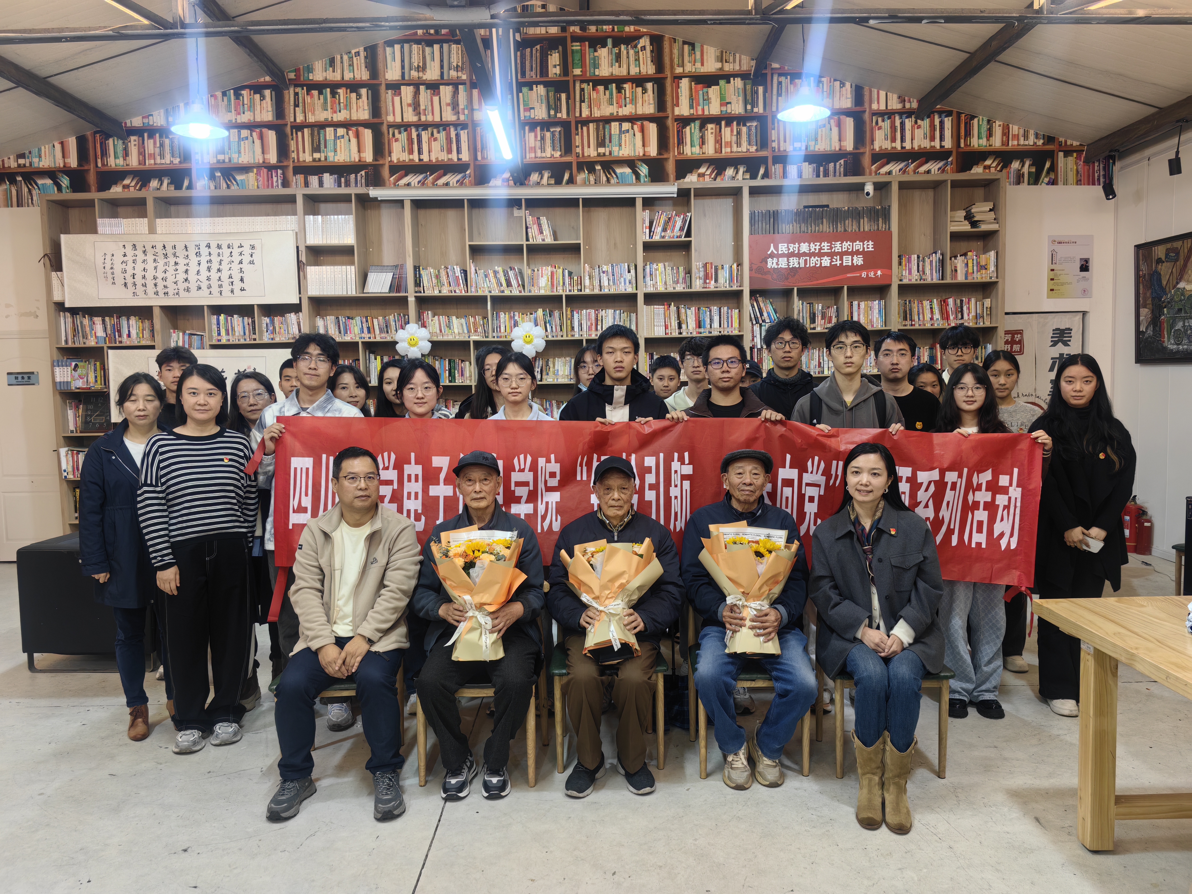 整场活动持续近两小时,老党员们朴实真挚的话语深深打动了在场每一位同学。大家纷纷表示,将以老党员为榜样,坚定理想信念,勤奋学习、积极实践,努力成长为可堪大用、能担重任的时代新人。活动最后,学子们向老党员献花致敬,全体参会人员合影留念,本次主题交流在温馨庄重的氛围中圆满结束。