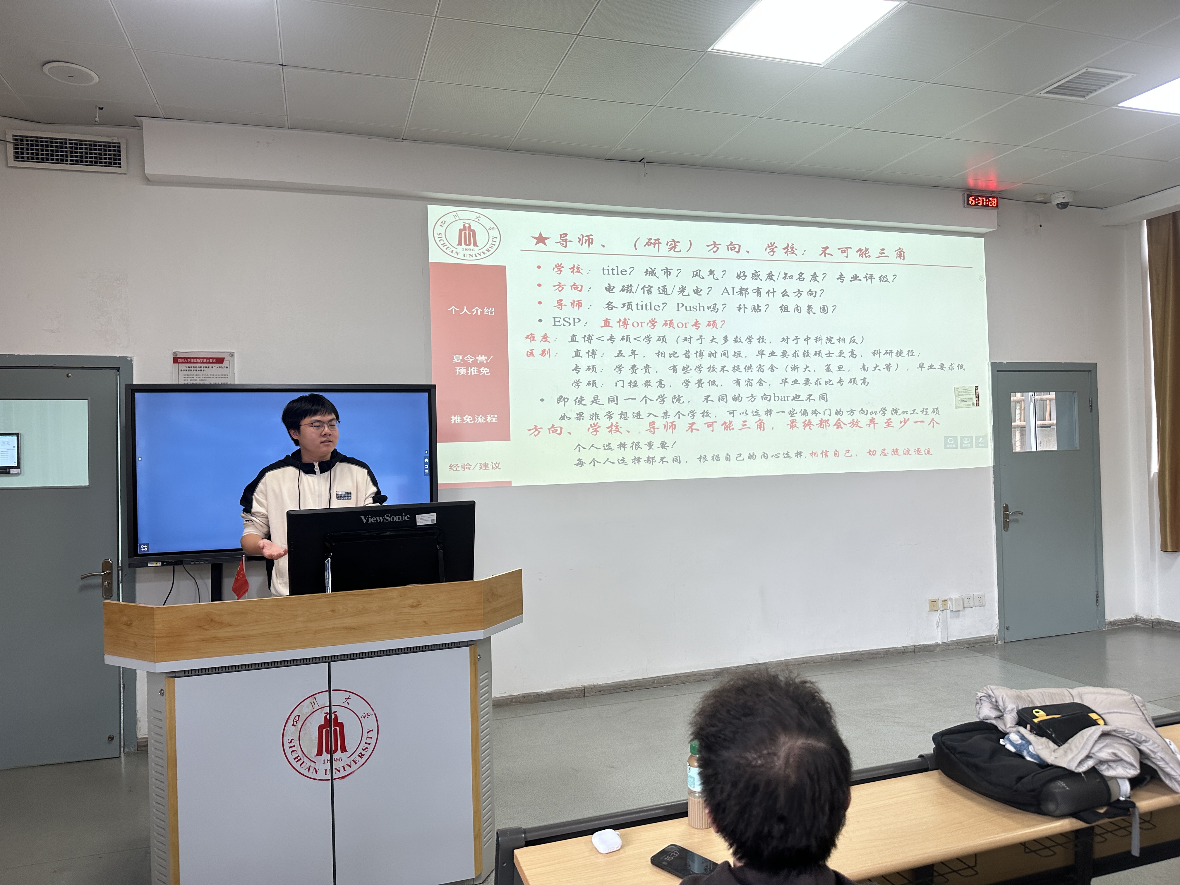 为搭建优良学风传承桥梁,助力2023级学子明晰保研路径,2025年11月1日至11月2日,江安本科党支部联合电子信息工程专业本科第一党支部邀请八位成功保研至清北、浙大、中科院等顶尖院校的高年级学生,分享保研路上的宝贵经验。