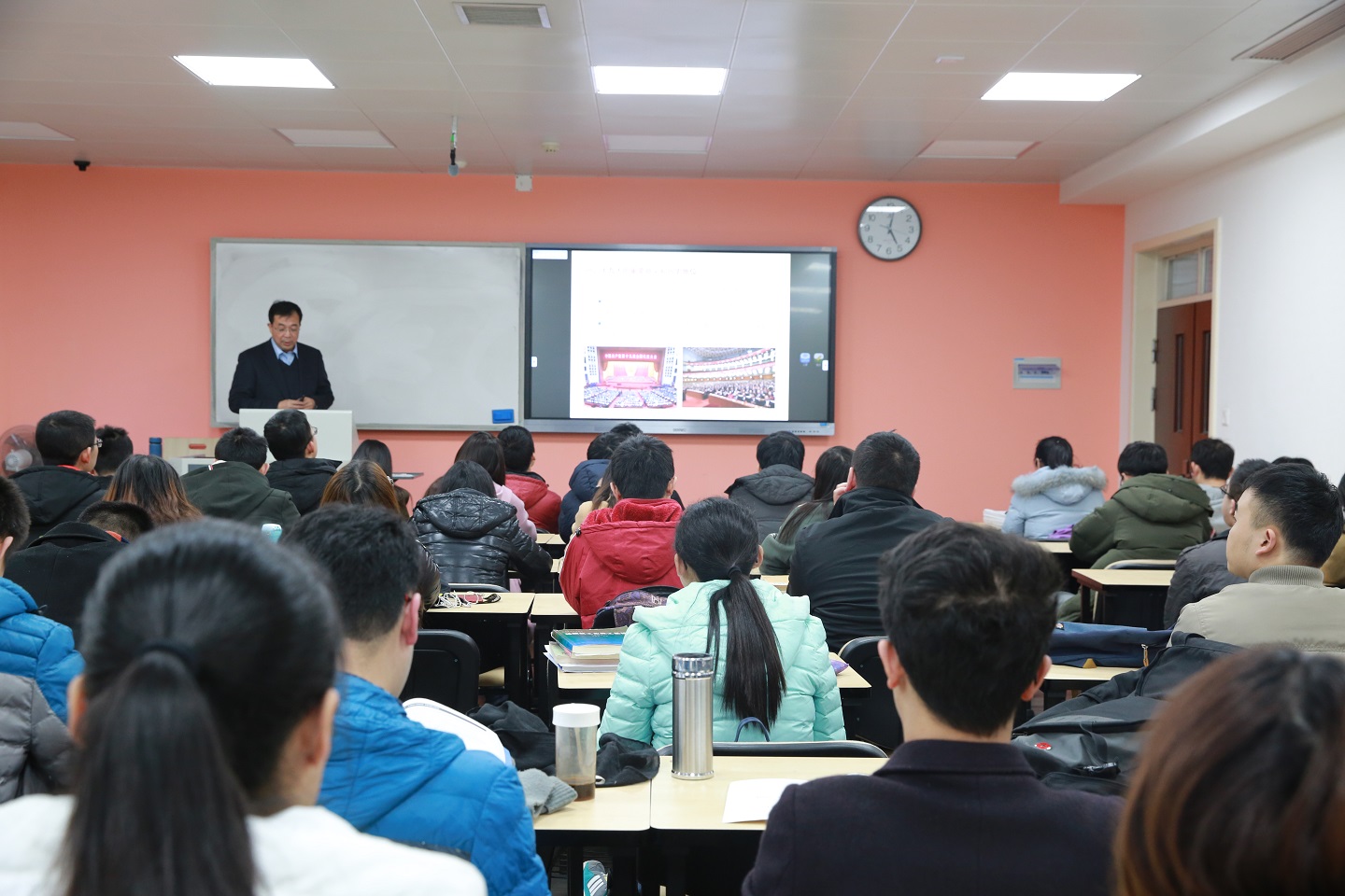 下午5点,讲座正式开始。首先,邰明松书记向大家讲解了十九大的重要地位和主要亮点,指出从十八大以来,通过“精准扶贫”、“简政放权”、“科技创新”等决策解决了许多长期想解决而没有解决的难题。并强调我国的主要矛盾已由人民日益增长的物质文化需要同落后的社会生产力之间的矛盾转变为人民日益增长的美好生活需要和不平衡不充分的发展之间的矛盾。然后,邰书记指出中国的高等教育事业发展进入新时代,从过去的重视“规模和数量”转变为现在的重视“质量和效益”,小欧视频
