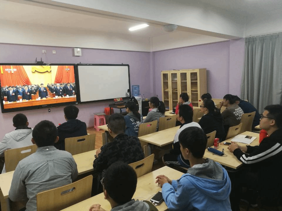 江安校区部分没有课的同学早早来到6舍学生活动室。会议直播在9:00准时开始。李克强总理主持全体出席人员唱国歌,为毛泽东、周恩来、刘少奇、朱德、邓小平、陈云等已故无产阶级革命家以及革命先烈默哀。在默哀之后,习近平总书记又代表十八届中央委员会向大会作报告。他指出,这次大会的主题是:不忘初心,牢记使命,高举中国特色社会主义伟大旗帜,决心全面建成小康社会,夺取新时代中国特色社会主义伟大胜利,为实现中华民族伟大复兴的中国梦不懈奋斗。以此为主题,习近平总书记总结了过去五年的工作和历史性变革。还指出了许多我们在今后的发展道路上要注意的问题,为我们国家未来的发展道路指出了明确的方向。习近平总书记号召我们全国人民要团结一心,为我们的共同目标奋勇前进。
