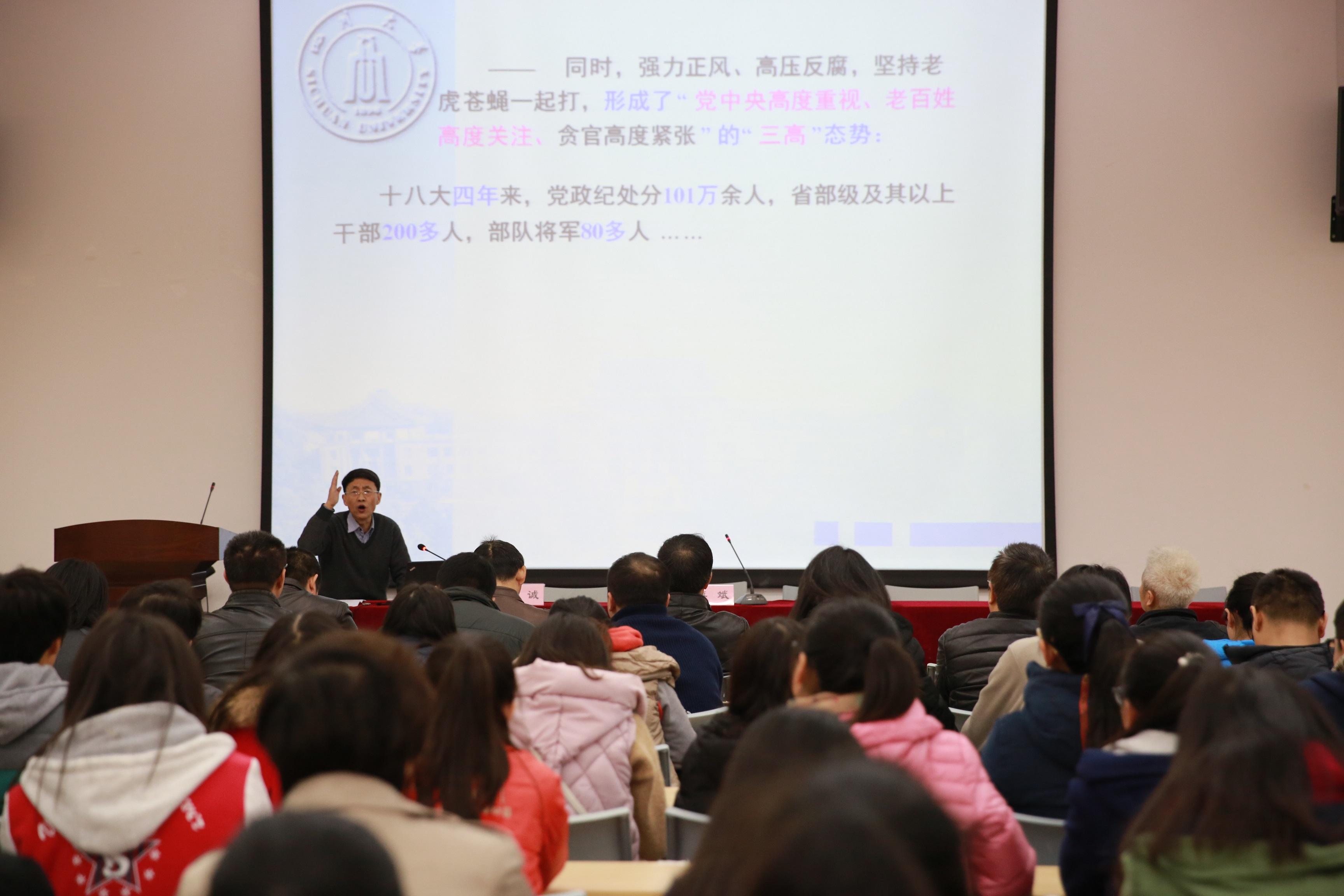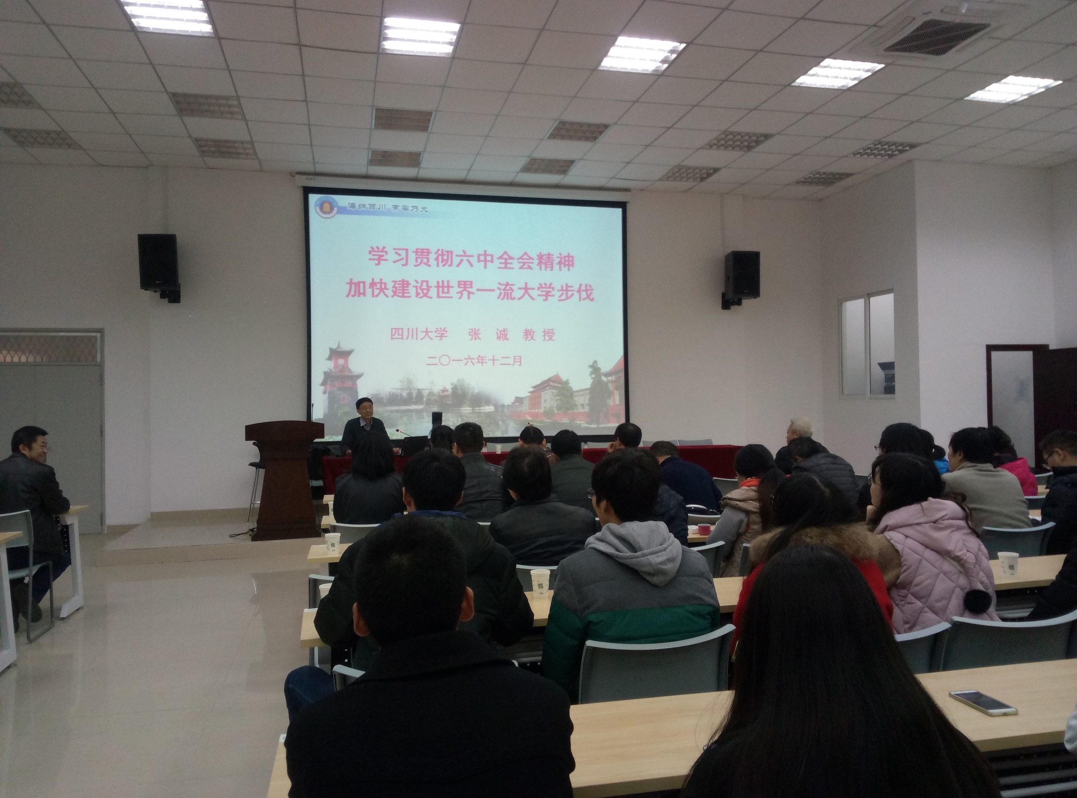 党委在望江校区五教附一楼101会议室举行“党的十八届六中全会精神宣讲报告会”,特邀学校宣讲团成员张诚教授主讲。报告会由院党委书记蒋斌同志主持,学院领导班子成员和党员师生职工参加了宣讲报告会。