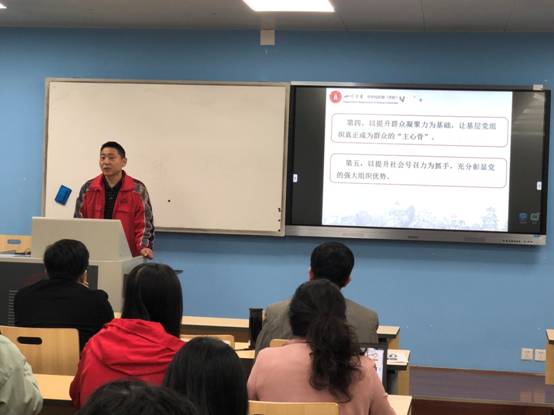 陈笃海副书记的主题党课以习总书记对于党的基层工作讲话谈起,结合党的十九大报告中明确指出的“加强基层组织建设”内容展开。他谈到,围绕核心抓党建,主要有“五抓”:基本教育、基本建设、基本队伍、基本制度、基本保障,强调要全覆盖,提升凝聚力和社会号召力,充分彰显党的强大组织优势。同时还要回归党章,充分认识党章的内容,以此为凭借。陈书记指出,基层党组织作为群众“主心骨”,开展党支部活动,要严格遵守党的组织生活制度,同时由于学生和教工是主要参与人员,因此党支部开展工作时要围绕“提升学生核心竞争力”为主要目标。之后,陈书记还从基层党组织建设方面主要存在的问题,支部党员大会的主要任务,发展党员工作程序等内容进行了说明和强调。