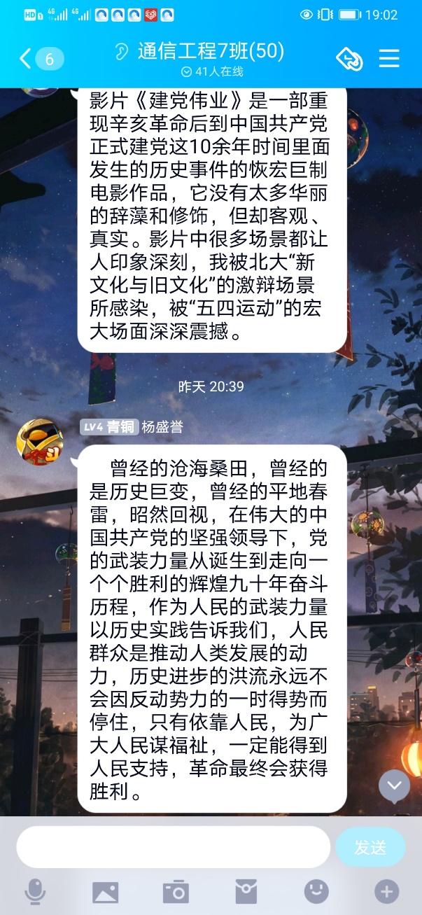本次活动以建军节为主题,带领同学们回顾历史,让同学们学习了解建军节的历史背景,并以此为基础,深刻发掘其内涵,让同学们关注时事,一定程度上保证了活动的参与度。本次活动由团支书孙泽宇主持,首先是班长宋慧琳同学进行了关于建军节的演讲,然后播放了电影《建军大业》,最后所有参会同学在QQ群里发表了自己的感想。此次活动前期准备充分,形式新颖。