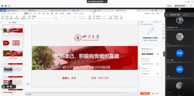 硕博支部4班和8班于线上举办了以“严明律己,积极向党组织靠拢”为主题的党史学习活动,本次活动由8班团支书朱晗为主讲人,带领4班和8班的同学们学习英雄人物们的入党故事,并鼓励大家积极向党组织靠拢。