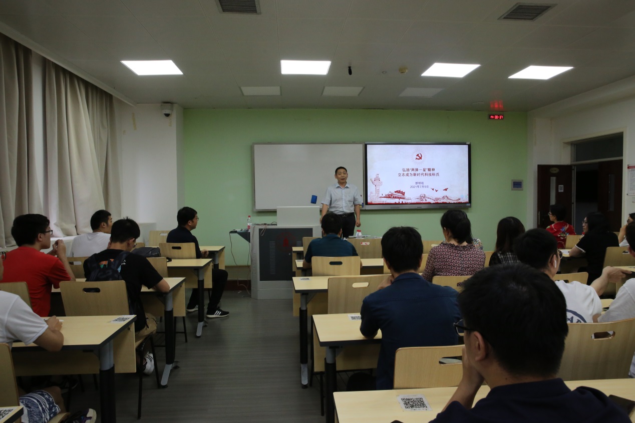 在望江校区基础教学楼A307室召开了党史学习教育专题党课。学院党委委员、纪委委员、教职工党员代表、本科和研究生新入党学生代表参加了本次党史学习教育专题党课。专题党课由学院党委副书记陈笃海主持,学院党委书记邰明松作了题为《弘扬“两弹一星”精神立志成为新时代科技标兵》的专题党课。