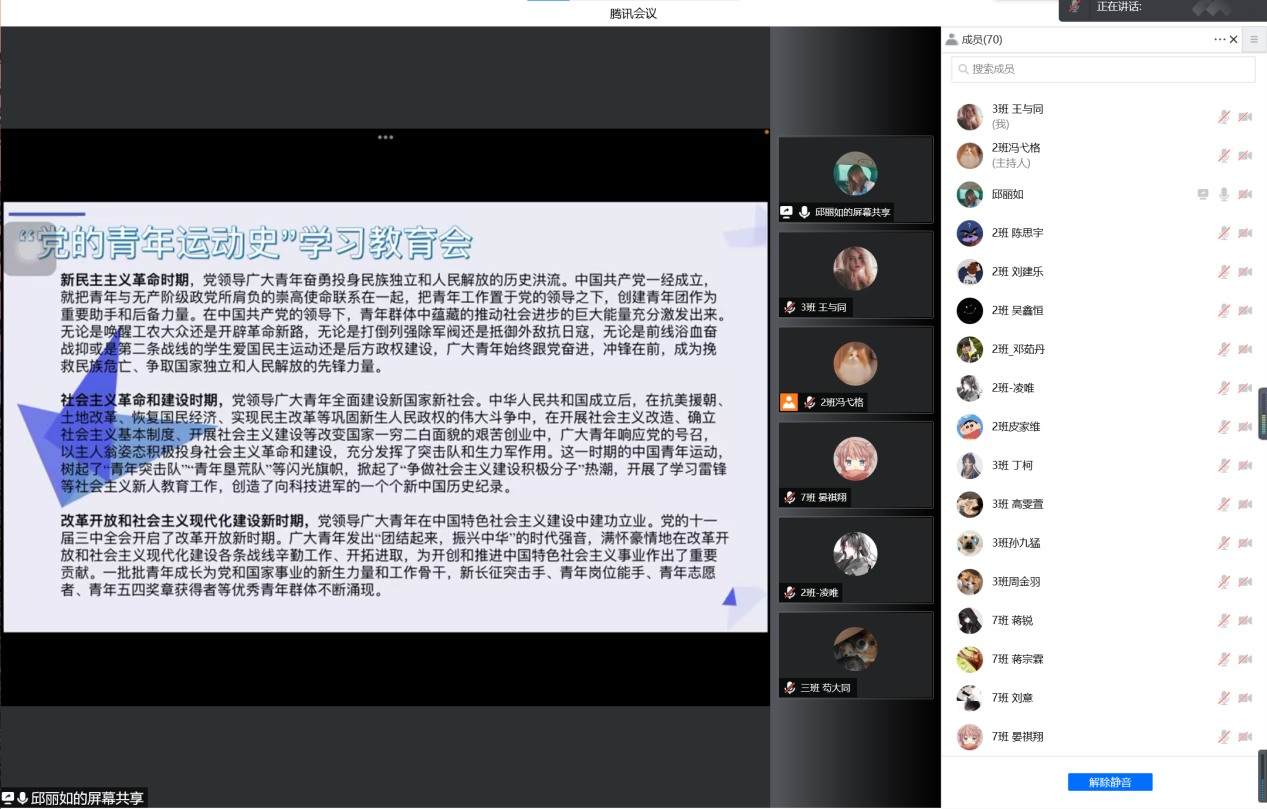本科2020级2班、3班和7班团日活动在线上举行。本次团日活动的主题是“青春心向党—坚定跟党走、建功新时代”。举办本次团日活动旨在通过回顾党的百年奋斗重大成绩和历史经验,特别是党领导中国青年运动的光辉历程,引导团员青年深刻感悟新时代党和国家事业发展的伟大成就和经验教训;同时组织开展学习先进精神,引导青年深刻体会习近平总书记对青年一代健康成长的重要要求,提升同学们的社会责任感和使命感。