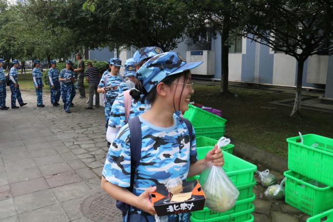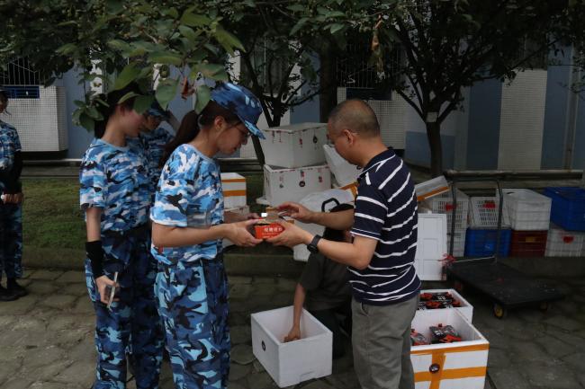 接下来进行慰问品的发放,各连队同学依次领取,秩序良好。此次活动慰问品内容十分丰富,包括炸鸡和水果等,消除了夏日的暑气,同时满足了同学们的需求。回到寝室后,许多同学就迫不及待地开始享用炸鸡和水果。炸鸡喷香,西瓜清凉,香梨多汁,桃子香甜,美食好像驱散了军训期间的劳累,给劳累的身体注入了能量,也带来一丝夏日清凉的惬意。