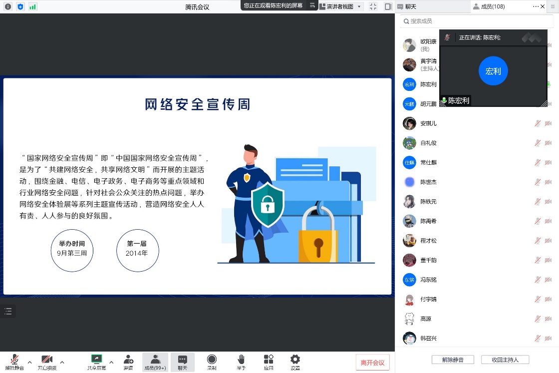 2019级本科学生第一党支部、第二党支部于腾讯会议线上联合开展了2022网络安全宣传周学习活动。本次活动由第一党支部组织委员陈宏利同志进行分享交流,第一党支部、第二党支部全体预备党员参加学习。