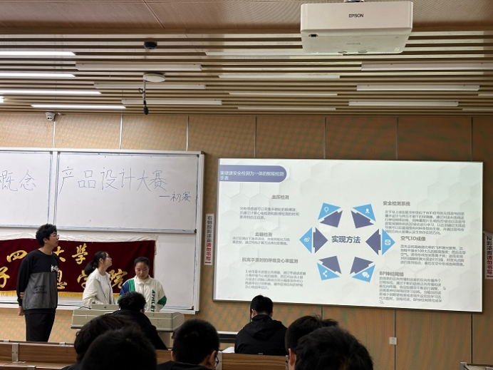 首先,各个队伍的队员从前门进入并进行签到,然后耐心地坐在教室后排候场,等待工作人员的通知。接着,各个初赛的参赛队伍依次上台进行PPT的展示,每个参赛队伍的队员们都很积极地对本队伍的概念产品进行介绍,他们的介绍包括概念产品设计的灵感来源,以及对产品的多维度思考,还有产品对个人或者是社会的贡献等等,比赛很顺利地进行,每个队伍都收获了激烈的掌声。每个队伍在展示完毕之后,郑世杰,徐彬,郭俊峰三位学长都会进行评分,并且会对一些创新性的想法做出赞扬,同时对一些不足的想法予以补充,这启发了每个参赛队伍。最后,郑世杰,徐彬,郭俊峰三位学长就概念产品设计大赛初赛做出总结并根据对每个参赛队伍的评分评选出参加概念产品设计大赛决赛的队伍名单。