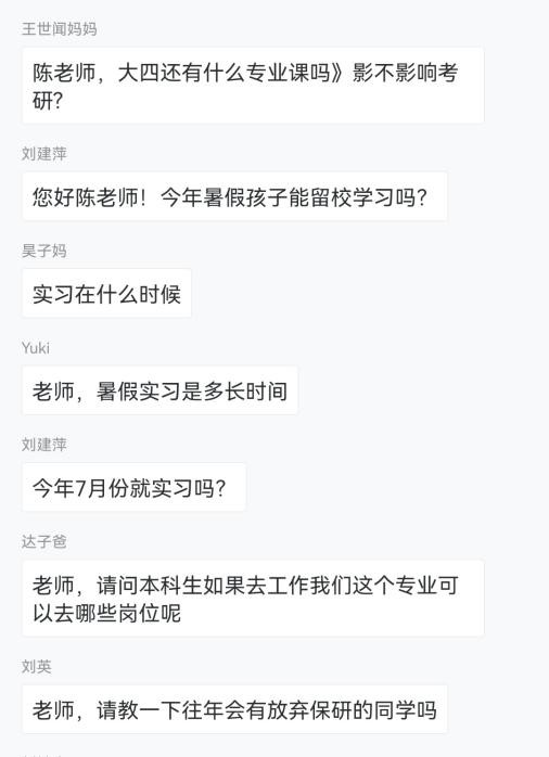 会议最后,大部分家长在评论区提出了自己的问题,陈晓娟老师针对每个问题都做了耐心、详尽的解答,家校之间沟通良好。本次家长会让家长们详细了解了孩子们未来的方向以及规划,有助于帮助学生以后有更好的发展。