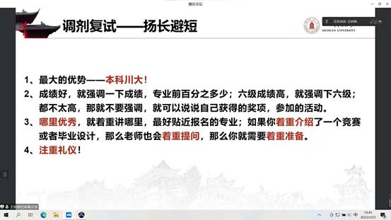 随后, 成功调剂到厦门大学的王林琳学姐先进行分享。她分享了准备调剂所需要做出的准备和获取的信息途径,充分对比自己的自身情况和学校接受的可调剂的专业代码及分数要求,同时要注意往年学校的报考和录取情况,时刻关注官网信息,准备材料。此外,在调剂复试中,要做到扬长避短,着重强调自己的优势,并注重礼仪。