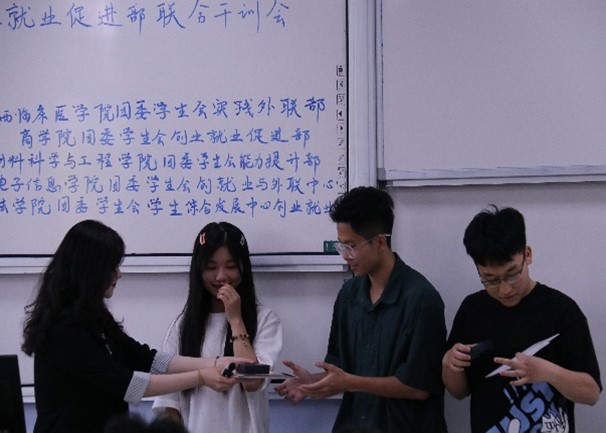 斯人定何人,游戏得自在。在较为严肃的干事培训环节结束之后,为了活跃现场气氛,此次活动的策划者们还特别设计了一个游戏环节。富有趣味性与参与性的小游戏例如击鼓传花,让很多现场的同学感到十分放松与愉悦,也拉近了嘉宾与同学们的距离,加强了各个学院创联干事之间的交流,从而让大家有一个更加积极的心态面对接下来的工作生活。