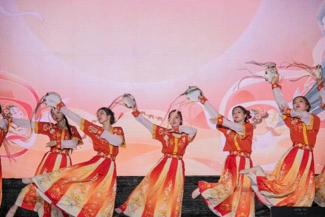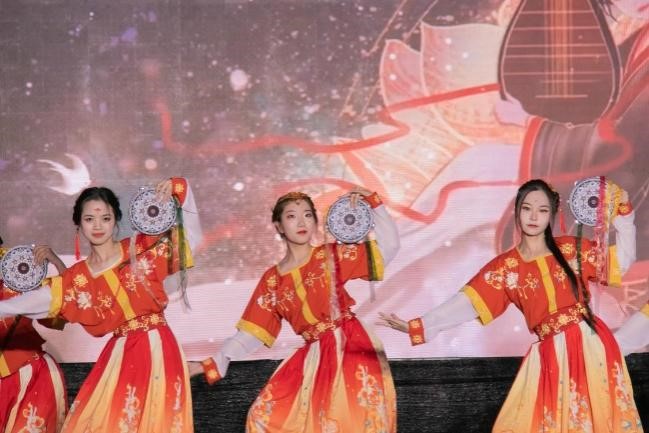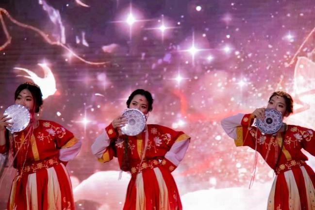 的舞蹈以铃鼓这一乐器作为中心意象展开,将具有敦煌西域元素的古典舞《上铃鼓》结合新时代的时代特色以更具青春与典雅的编排展现给观众。渐强渐弱的铃声贯穿整个节目,如同来自千里之外的悠扬琴音,再加上舞者们婉约俏丽的身姿、恰到好处的妆容与柔美但不失力度的舞步,再配上光彩陆离的舞台灯光与特色鲜明的背景音乐,将大家在不知不觉之间带向了素未抵达的秀美西域。更深层次来看,舞者们通过极具西域特色的舞蹈向台下来自五湖四海的观众们展现了中华民族文化的多样性与包容性。满地百花九州香,土生万物四时春。以民族之舞传递中国之声,更是对祖国秀丽河山,各民族和睦相处,团结共进的赞美与讴歌,也让民族团结与互助的种子深埋与每位观众的心田。