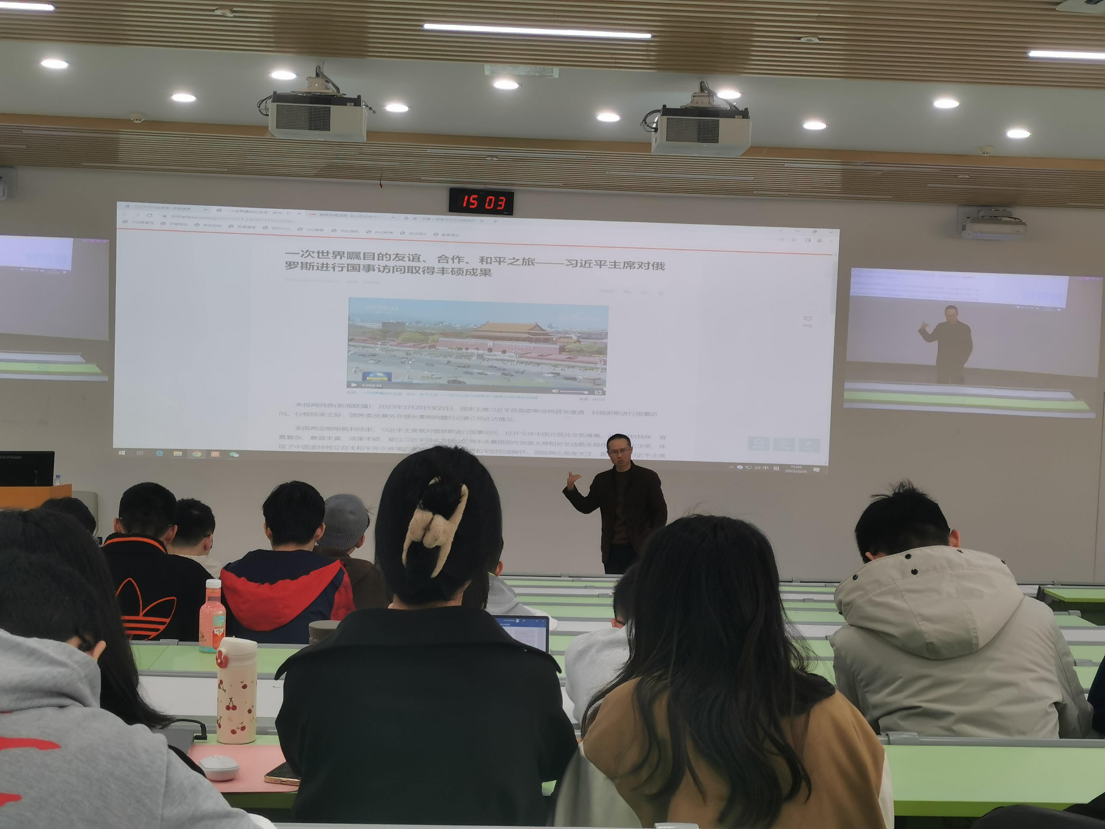 2023年3月24日基础教学楼C201,谢老师组织开展了丰富的形教课程。整个课堂分成了两个部分。第一部分是由王萍学姐进行的征兵宣讲。王萍学姐通过短视频的方式,以幽默俏皮的风格讲述了自己温馨欢乐又别致的军队生活。王萍学姐分享到“强军之道在于强人”军队越来越注重高素质人才的培养,希望更多大学生参军入伍,通过参军入伍,同学们也能够收获别样的人生体验。
