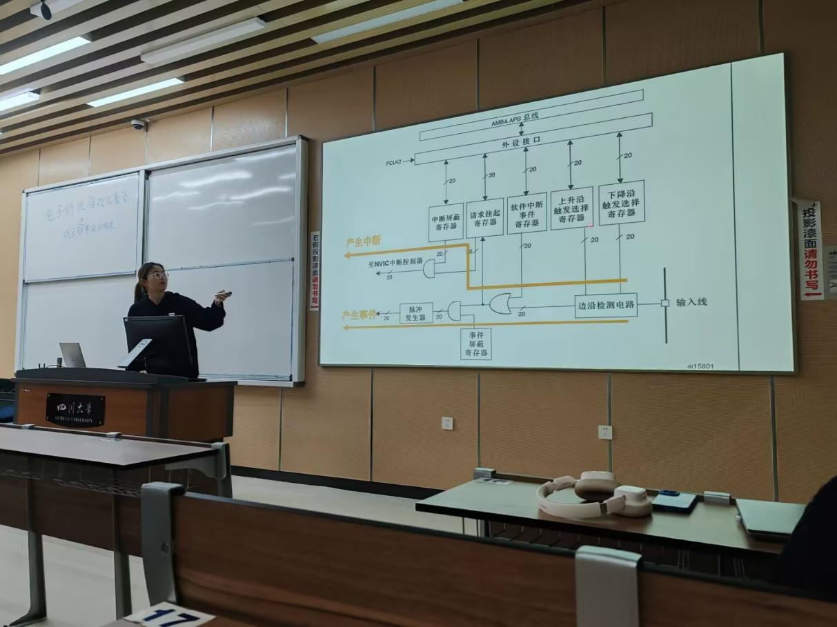 首先,李唯含学姐带来了有关中断功能相关知识的讲解,介绍了中断及中断嵌套的定义、使用中断的好处等基础知识,并就NVIC优先级分组、EXTI、AFIO引脚复用等相关知识进行详细讲解。接下来,为加深同学们对于中断相关知识的理解,李代强学长在李唯含学姐所讲述内容的基础上进行了补充说明,并绘制框架图帮助同学们更好地学习中断相关知识。最后,杨滨荣学长带着同学们进行编写程序的实际操作练习,使用能实现中断功能的程序来控制流水灯的变化模式。