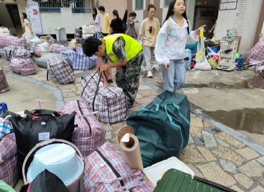 新生军训结束后志愿者们迅速集合分工,分别前往西园八舍和西园十一舍开始了紧张而有序的物品搬运工作。他们或是引导学长学姐搬运重物,或是细心看管物品,确保每一样物品都安全无遗漏。志愿者们身着统一的服装,穿梭在宿舍楼间,他们的身影成为了一道亮丽的风景线。在搬运过程中,志愿者们动作熟练、配合默契,有的肩扛大包,有的手提小件,每个人都全力以赴。汗水浸湿了他们的衣背,但他们的脸上始终挂着微笑,那份认真和热情感染着在场的每一个人。