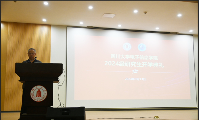在文华活动中心一楼报告厅成功举行了2024级研究生新生开学典礼。学院院长杨阳教授、党委廖勇明副书记、副院长卿粼波教授、教师代表周新志教授、辅导员张帆老师及全体2024级研究生参加了本次典礼,典礼由党委副书记廖勇明主持。