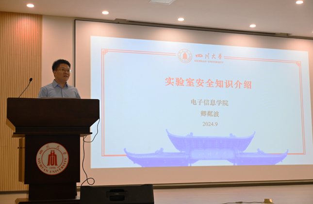 学院副院长卿粼波教授讲解了实验室安全知识。他强调实验操作中的安全规范,包括防护措施、设备操作和应急处理的重要性,提醒学生严格遵守实验室规章制度,防范意外事故。同时,卿粼波教授还提到实验室共享资源的合理使用和保持整洁有序的工作环境,希望大家在科研中不仅追求创新与进步,也要始终把安全放在首位。