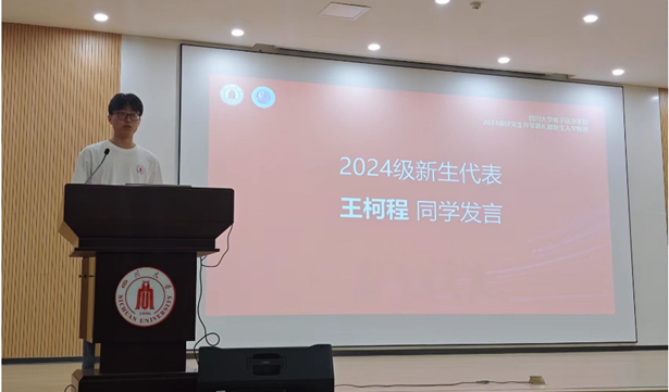 随后,2024级新生代表王柯程同学进行了表态发言。他分享了过去一年的支教经历,谈及自己对教育与责任的感悟,并表示支教经历让他学会了坚韧与奉献。王柯程同学认为,科研应聚焦人民需求,做出对社会有益的研究。最后,他表达了对新起点的期待,并承诺珍惜学习机会,积极投身科研创新,不断提升自我、回馈社会,努力在新的学术旅程中取得优异成绩。