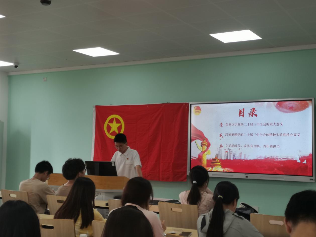 活动在团员们嘹亮而激昂的团歌歌声下拉开了序幕。首先团支书莫斌斌带领全体成员共同学习了党的二十届三中全会的核心内容和精神,并鼓励同学们不仅要成为改革成果的享受者,更要积极投身于推动全面深化改革的伟大实践中去。在学习之后设置的小组答题环节,增强了大家在理论学习中的参与感和获得感。