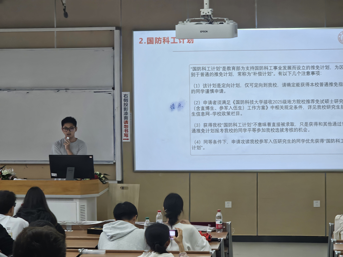 此次分享会,邀请到三位成功保研的2021级同学,为大家深入分享保研的相关知识与宝贵经验。他们结合自身保研经历,围绕保研要求、夏令营、预推免以及保研相关准备展开介绍,让同学们对保研有了更为清晰的认识。其中保送至浙江大学攻读博士学位的王凯明同学围绕学术研究向大家介绍科研相关知识;保研至东南大学的胡琳悦同学以自身在学术道路上的努力和成就,为即将面临保研挑战的同学们树立了良好的榜样;保研至国防科技大学的夏昱科同学结合其在学术、科研方面的出色表现,为同学们展开全面、细致的介绍。在随后的问答环节中,同学们热情高涨、踊跃发言,现场气氛热烈而融洽,大量参会同学表示受益匪浅、深受鼓舞,对保研路径有了更加清晰而全面的认识、对未来规划有了更明确的目标。