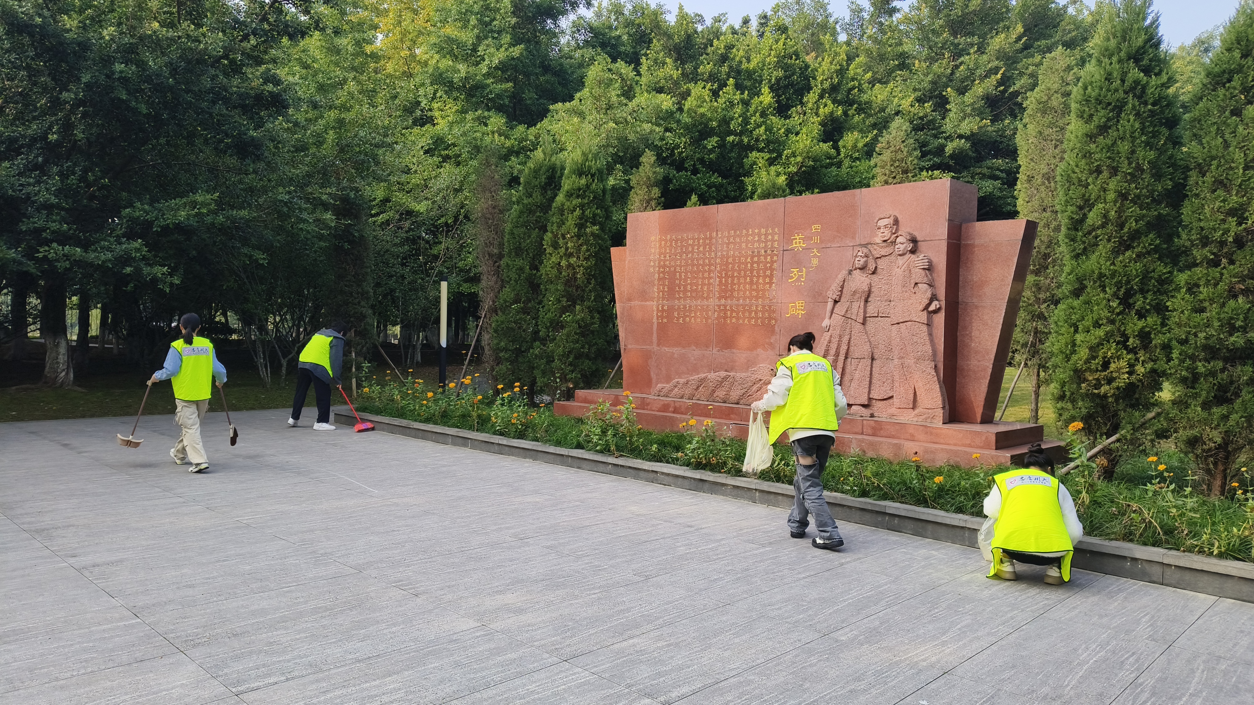 图为同学们认真打扫江安碑及其周围地区