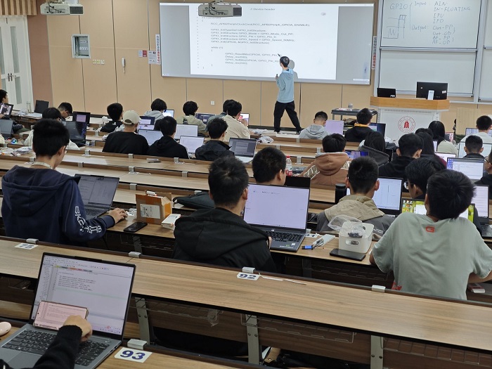 江安校区综合楼C座C306开展了第二次授课,此次授课内容主要讲了GPIO和各元器件的线路连接与使用,包括LED灯、蜂鸣器、轻触按键、OLED 屏等。