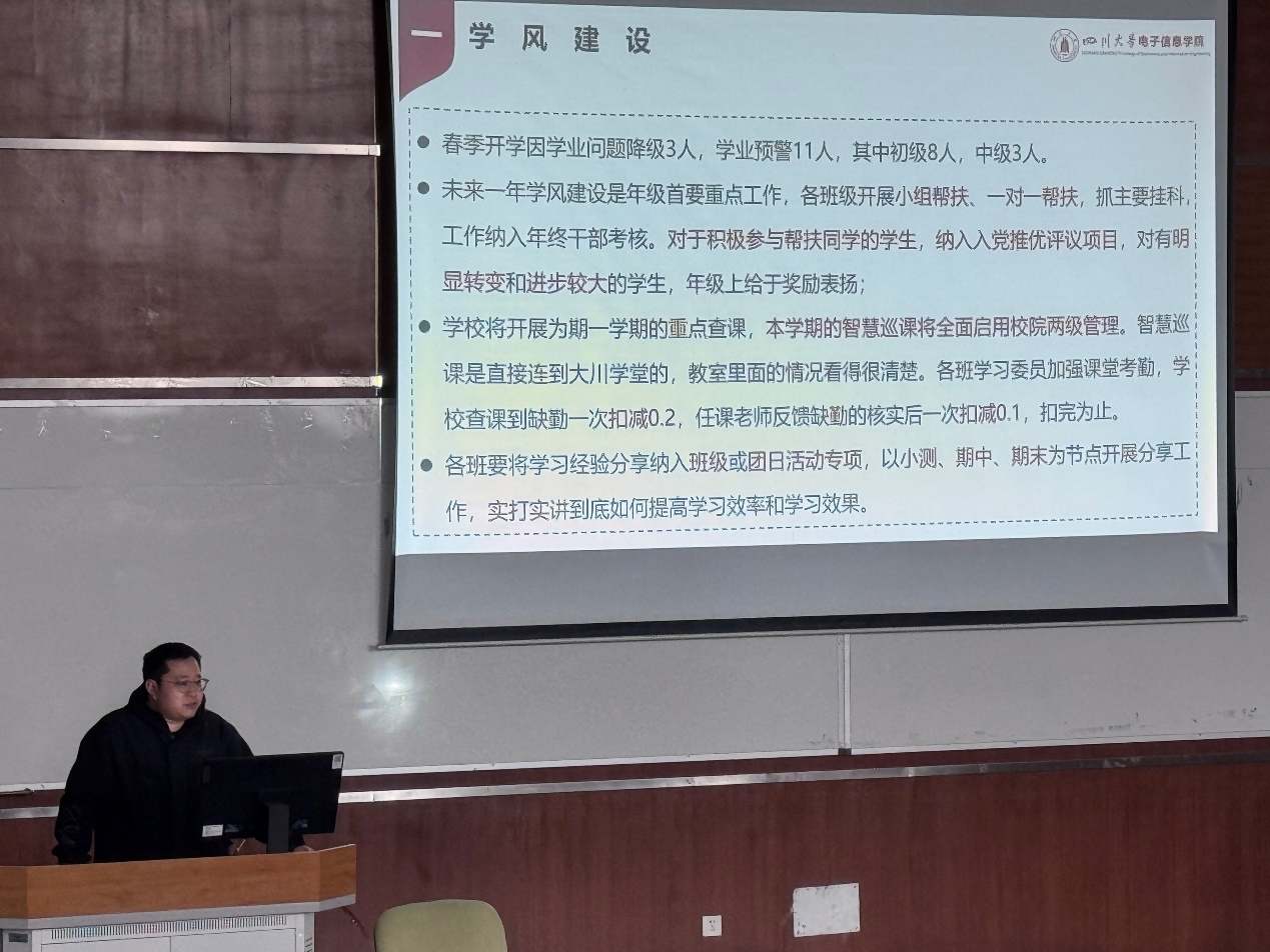 会议伊始,申鑫老师以详实的数据对上学期学业情况进行了全面分析总结,强调学风建设将是下一阶段年级重点工作,针对学业问题,年级已启动帮扶计划。本学期将推行“小组帮扶”和“一对一结对”机制,并将帮扶成效纳入学生干部考核及入党推优评议。本学期起,校院两级将通过“大川学堂”系统实时监控课堂考勤,各班学习委员需加强考勤管理,鼓励班级以期中、期末为节点组织学习经验分享专题团日活动,助力学生提升学习效率。