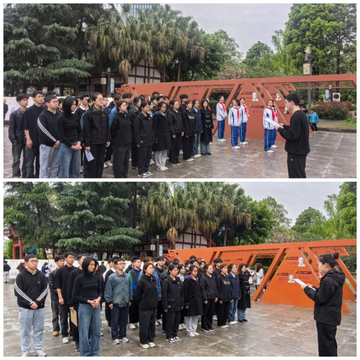 随后,全体党员在申鑫老师的带领下,重温入党誓词。大家高举右拳,庄严宣誓:“我志愿加入中国共产党,拥护党的纲领,遵守党的章程……”一句句铿锵有力的誓言,回荡在烈士纪念碑前,激励着每一位党员不忘初心,牢记使命。紧接着,全体团员在朱远诚的带领下,重温入团誓词:“我志愿加入中国共产主义青年团,坚决拥护中国共产党的领导……”团员们的声音洪亮而坚定,展现了新时代青年的蓬勃朝气和责任担当。