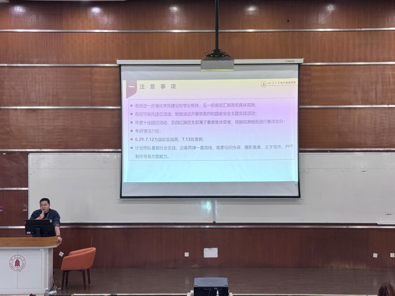 2023级本科4月年级大会在江安校区综合楼C407顺利召开。会议由辅导员申鑫老师主持,全体2023级本科生参加。会议围绕学风建设、党团工作、暑期实践及学业安排等重点工作展开部署,为同学们下一阶段的学习与成长指明了方向。