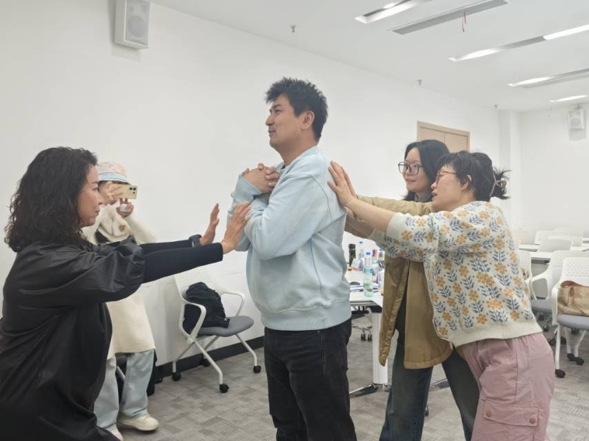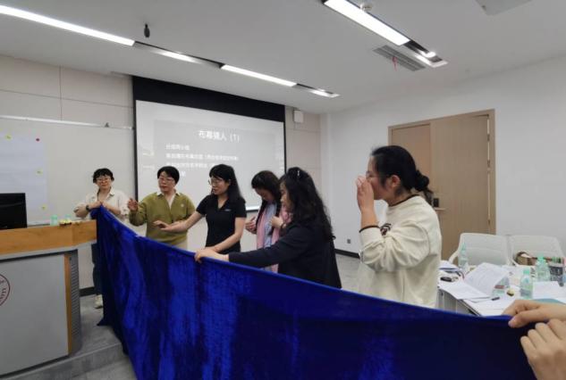 经过了前面两周的熟悉,团体沙龙来到第三周——团体凝聚阶段。凝聚力是团体的生命力,一个有效的团体,凝聚力是必不可少的,而信任是促成凝聚力的形成的重要方式,这个阶段准备了“信任倒”的游戏,团体分别用“双人信任倒”、“三人信任倒”、“风中柳”、“太空舱”等信任游戏,促使老师们觉察自己在生活中的角色,讨论“为什么信任这么难”增强了凝聚力的形成。