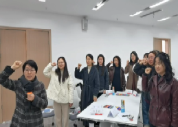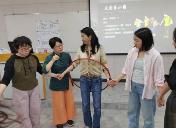 第四周,“大圈绕小圈”活动再次聚焦团队协作。全体成员手拉手围成圈,让呼啦圈在彼此身上传递。在四轮挑战中,大家不断总结经验,提出了诸如先套头再迈腿、同伴相互协助、脱掉高跟鞋等优化方案。最终,完成任务的时间从最初的32秒大幅缩短至18秒,成功实现了看似不可能的突破。活动结束后,大家围绕活动过程和在学生活动中的应用展开了热烈讨论。