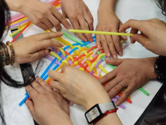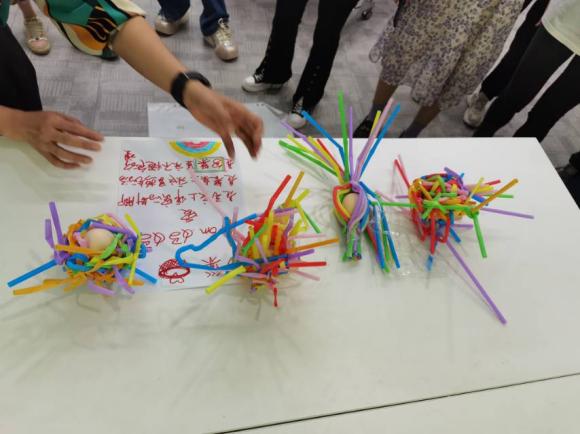 第五周,活动步入团队工作阶段。辅导员分为两组,利用60根吸管和两个生鸡蛋完成“防蛋背心”游戏,设计出能让鸡蛋从三米高空落下而不碎的作品。面对挑战,大家集思广益、分工明确,共同制作出别出心裁的“防蛋背心”,经过检测,其中三个作品从高空坠落保持完整。通过游戏老师们体验到团队合作带来的成就感,共同学习了团队辅导的设计原则,深入探讨了游戏背后的理论依据以及如何在学生活动中带给学生启示。