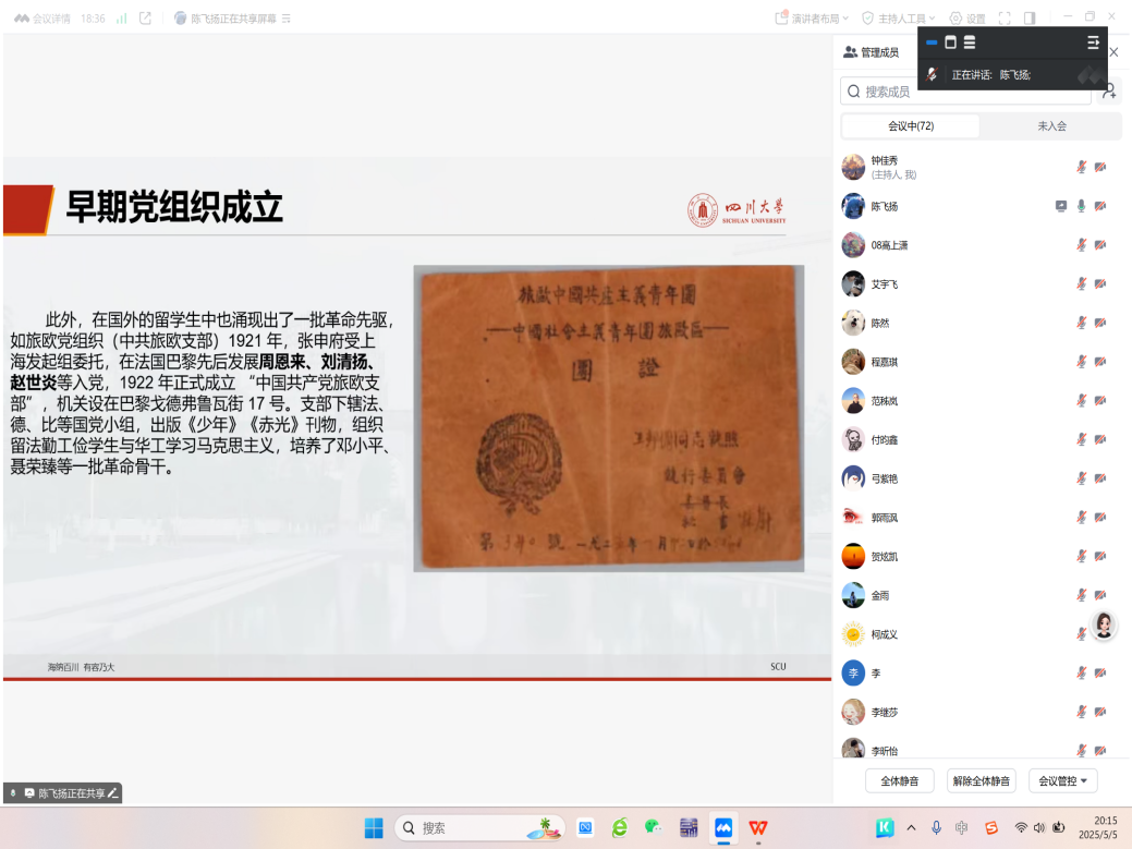 江安本科党支部于2025年5月5日晚上八点在腾讯会议线上举行八项规定学习分享和“红途轮忆,青讲党史”主题活动暨读书分享会。支部书记申鑫,支部党员、发展对象、部分入党积极分子和团组织推优成员参会。