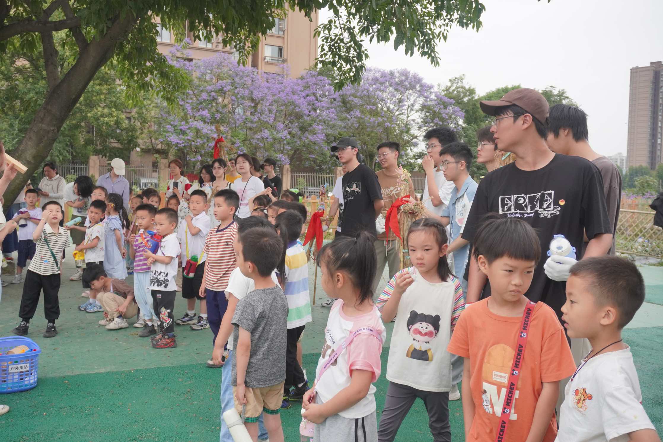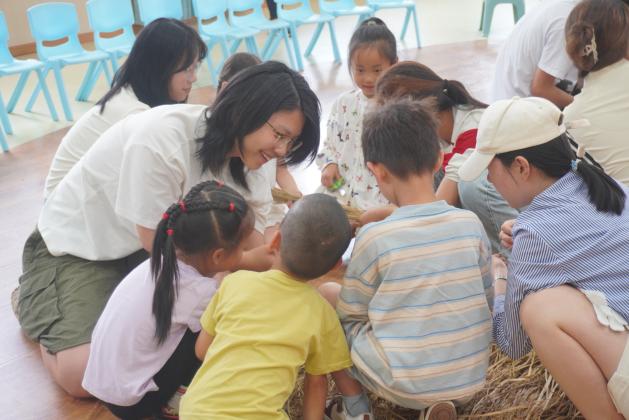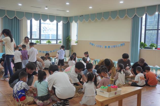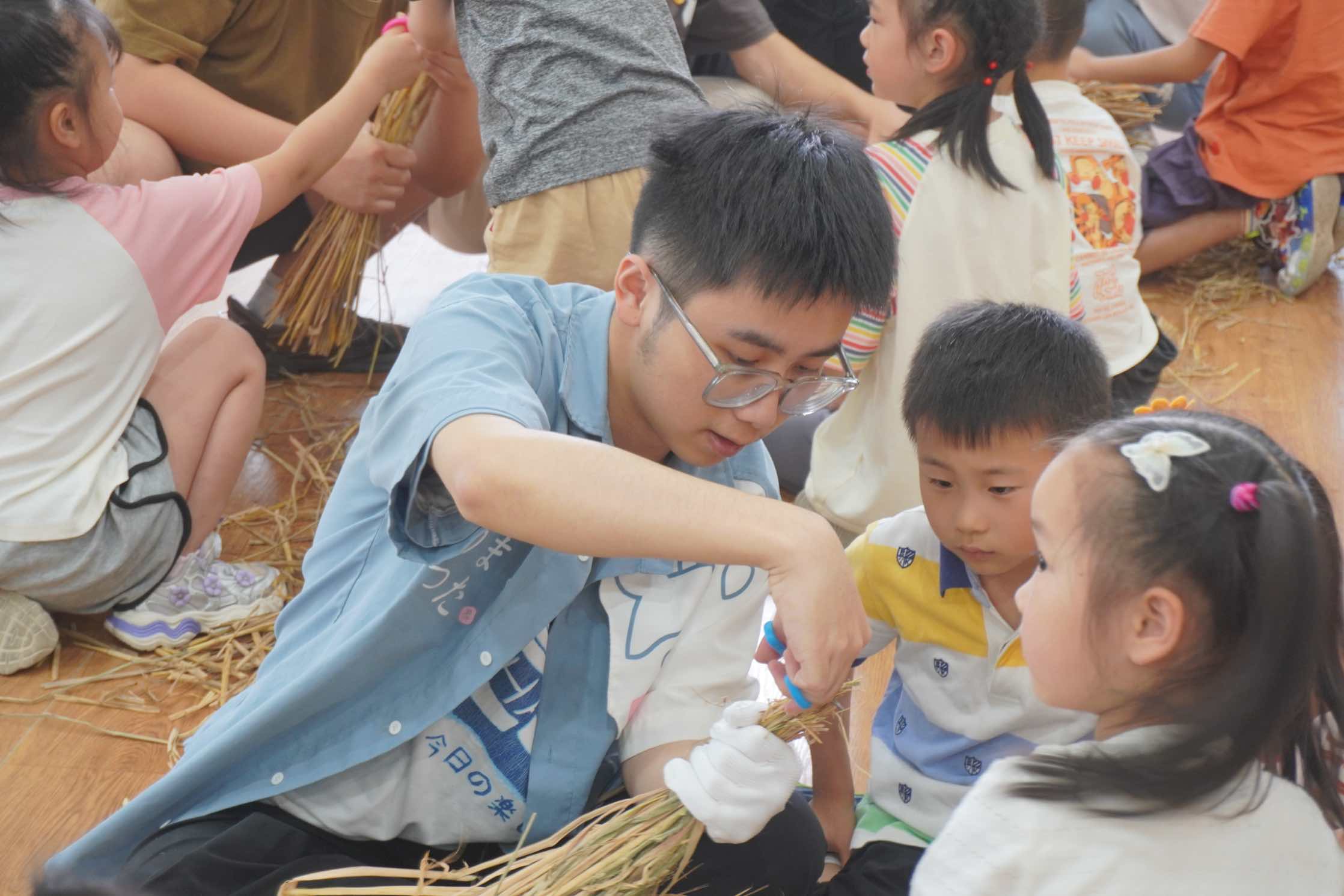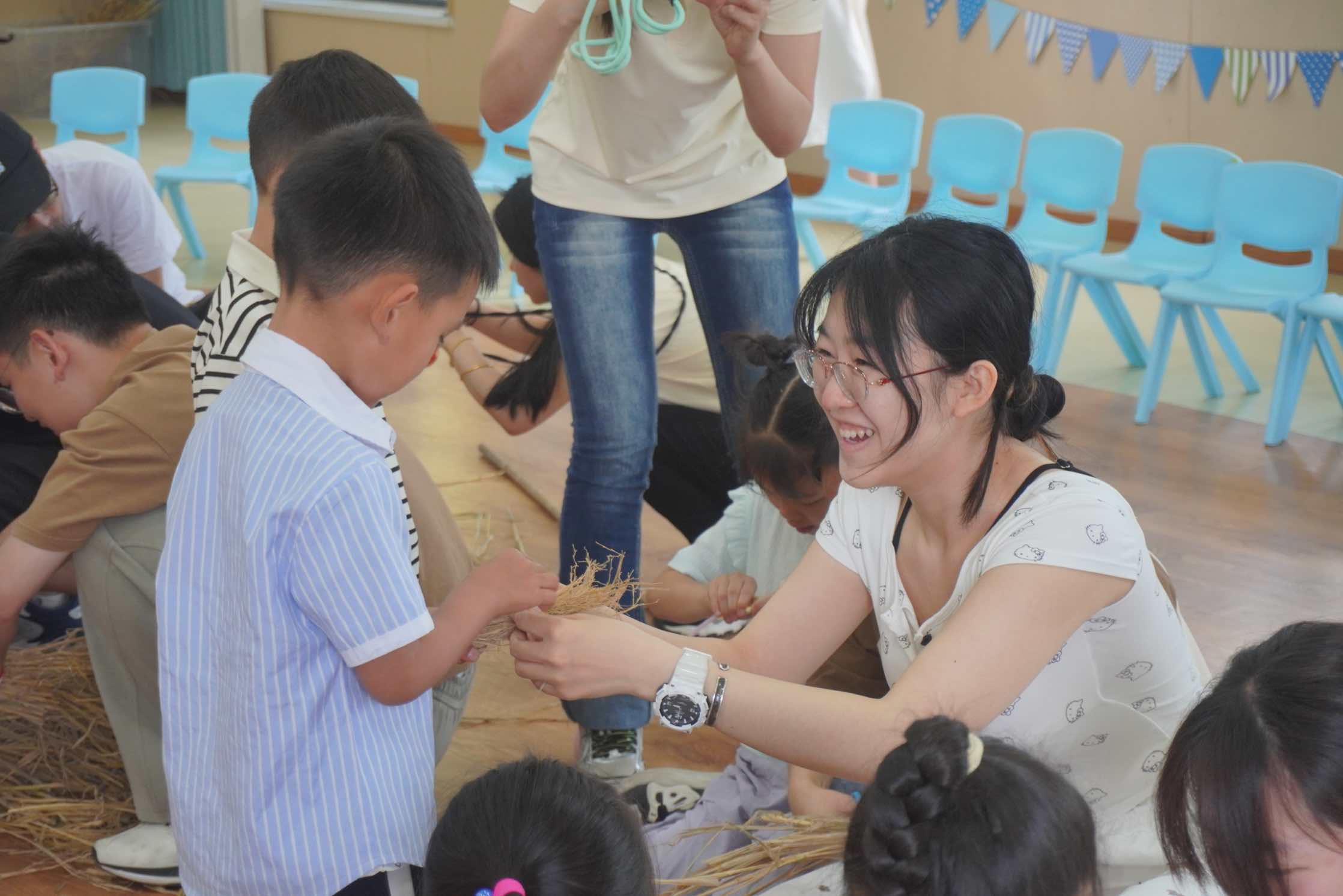 活动伊始,九班艾宇飞同学发言,对本次活动中社区和幼儿园的大力支持表示感谢。随后,十班张婧同学细心耐心地向小朋友们讲解了制作稻草人的步骤方法,从如何捆扎稻草,到怎样固定四肢和头部,每一步都详细示范。大家用稻草、扭扭棒等材料,充分发挥创意,制作出形态各异、栩栩如生的稻草人,有的像威武的战士,有的像可爱的动物,活动现场充满了欢声笑语。