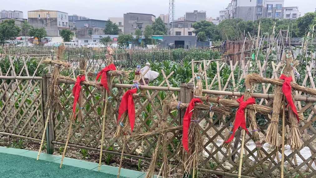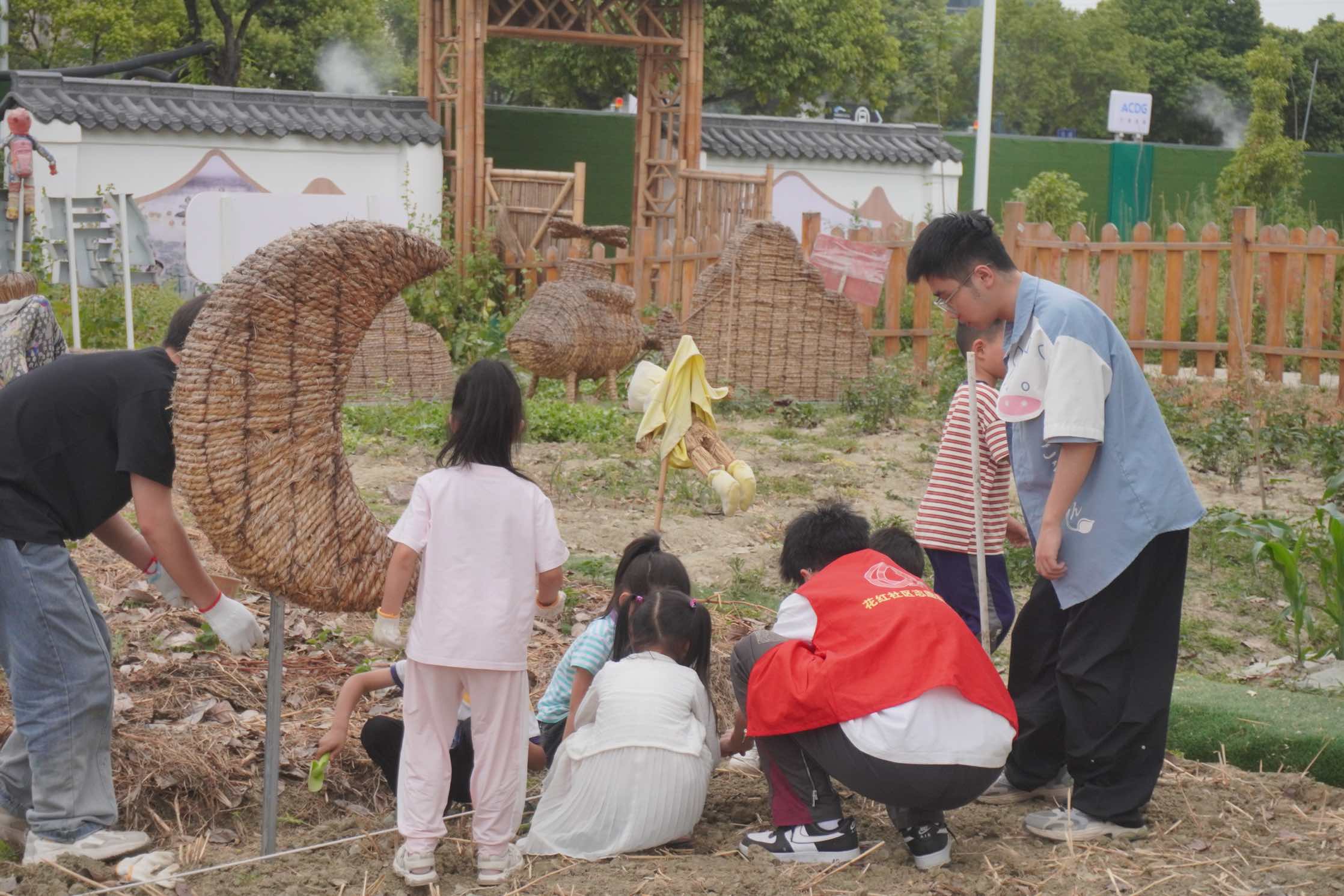 稻草人制作结束后,大朋友拉着小朋友的手来到了空港微菜园。在工作人员的指导下,大家按照“划线、定点”的方法一起播种花生、芋头种子。同学们耐心地向小朋友们传授技巧,小心翼翼地将种子放入土中,再轻轻覆盖上一层土。播种完毕后,大家插上了刚刚制作的稻草人来守护自己的土地,期待着丰收时节的到来。